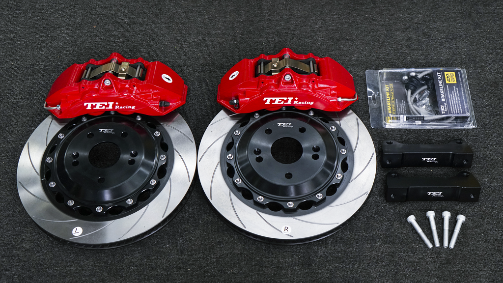 套件中搭配355MM划线碟盘+陶瓷刹车片+高性能钢喉+DOT4刹车油+专车定制合头桥/桥码等。大幅提升刹车系统的抗热衰减能力,及不耐高温所导致的刹车盘、片异常损耗问题。