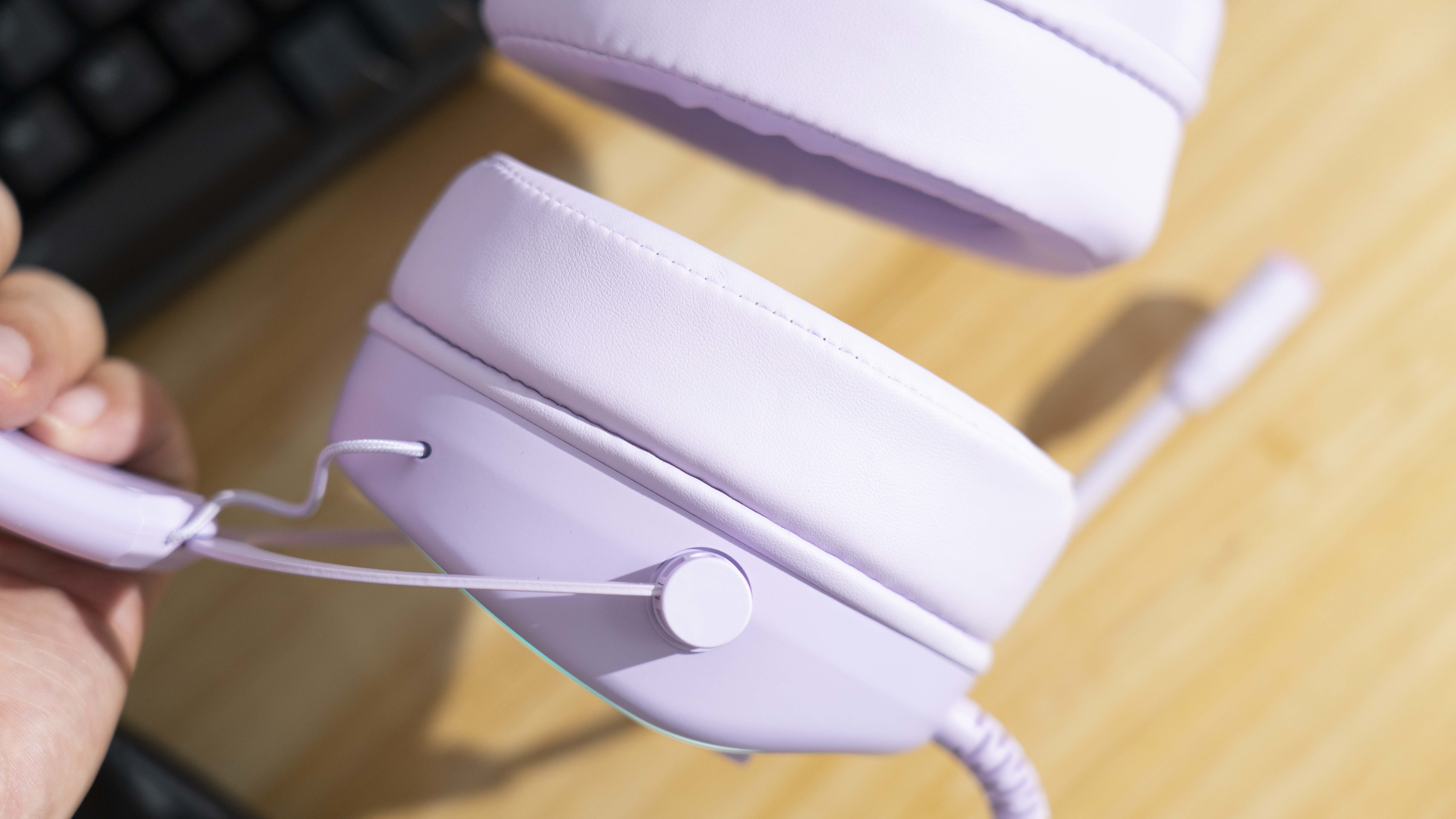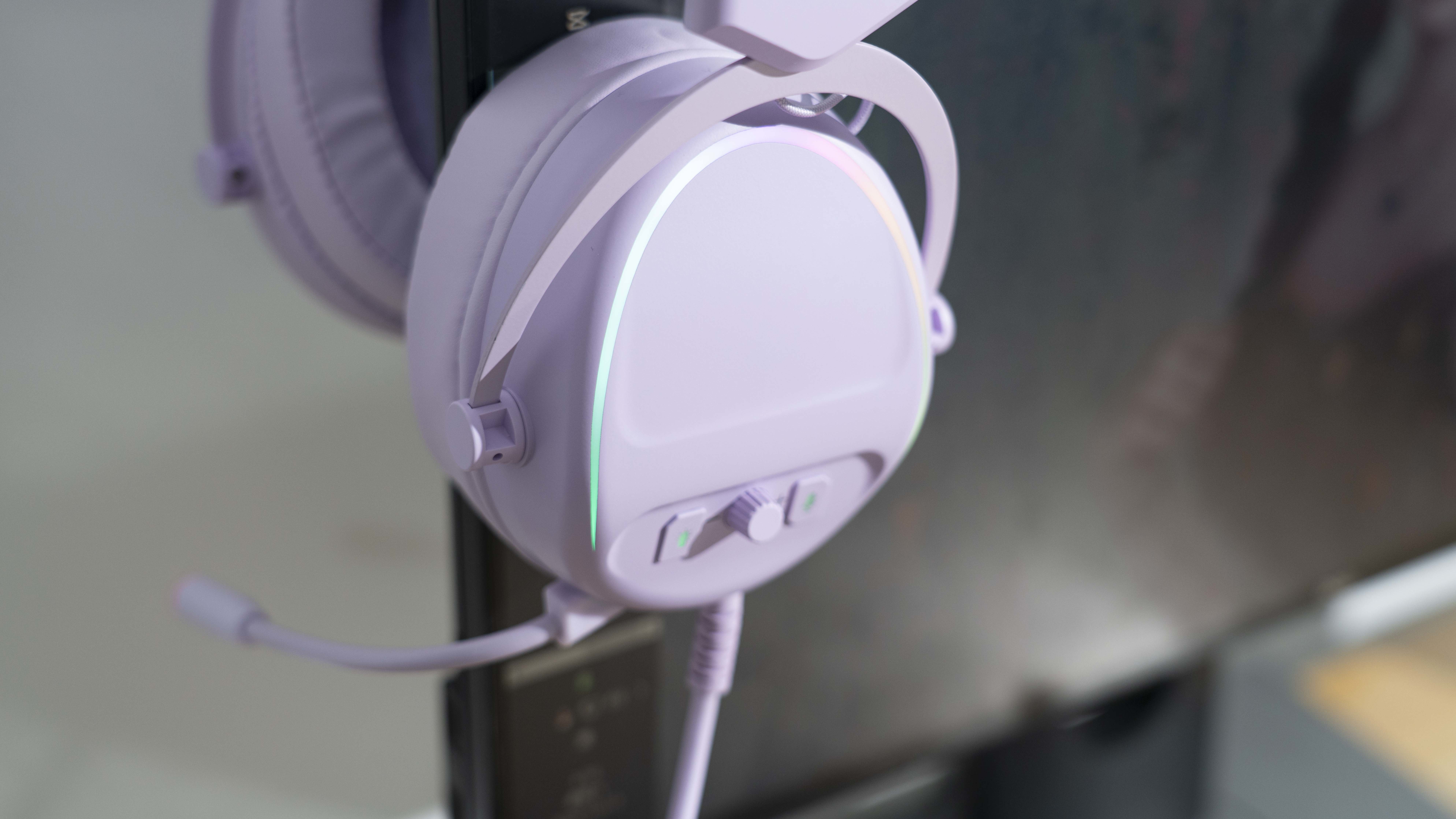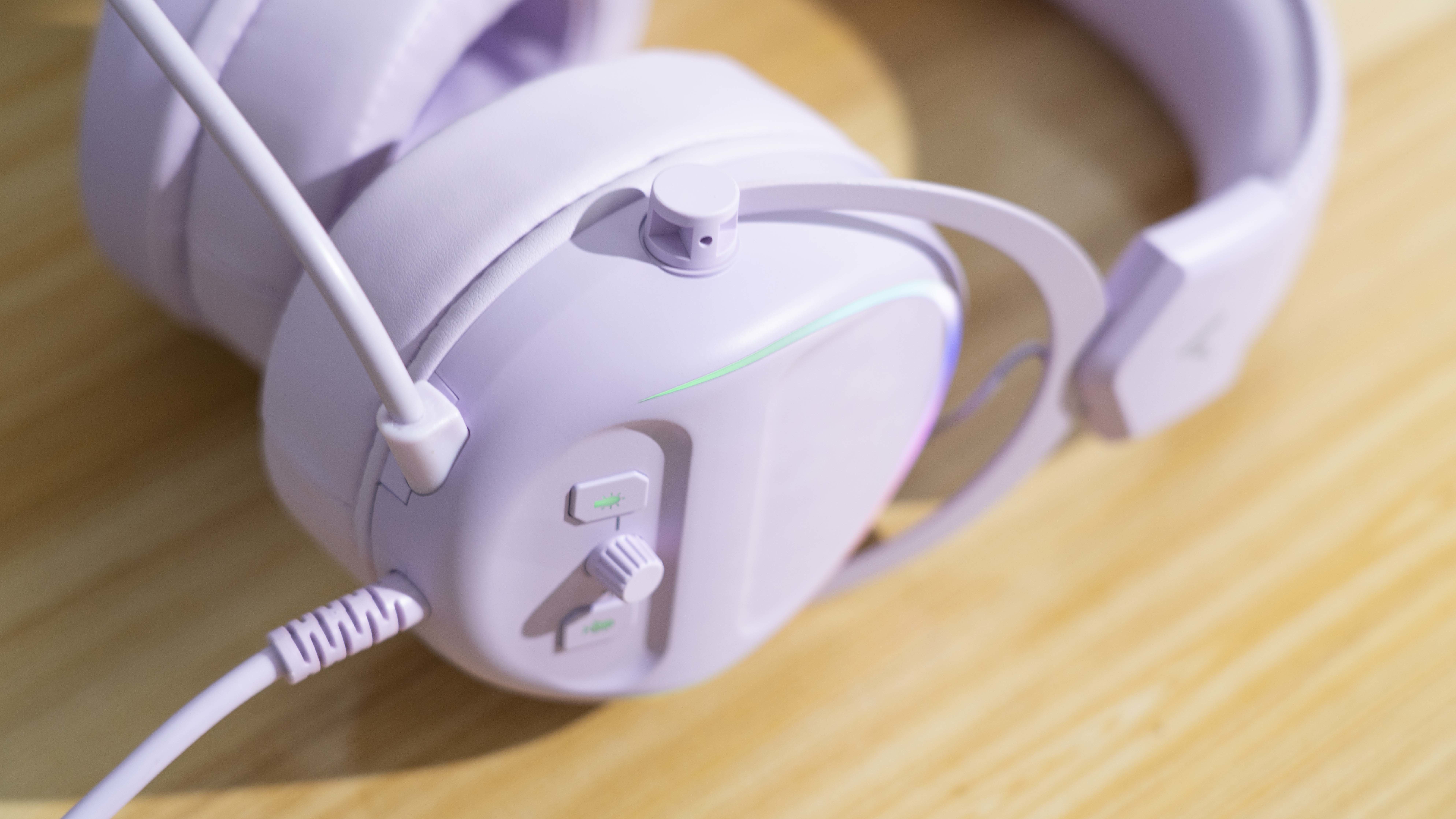 全机身迷雾紫色,皮质有质感,很柔软,耳罩加厚,长时间佩戴也不压耳朵,耳机的侧面可以调节音量以及麦克风的大小,搭配上RGB灯效,夜晚更加绚丽多彩。