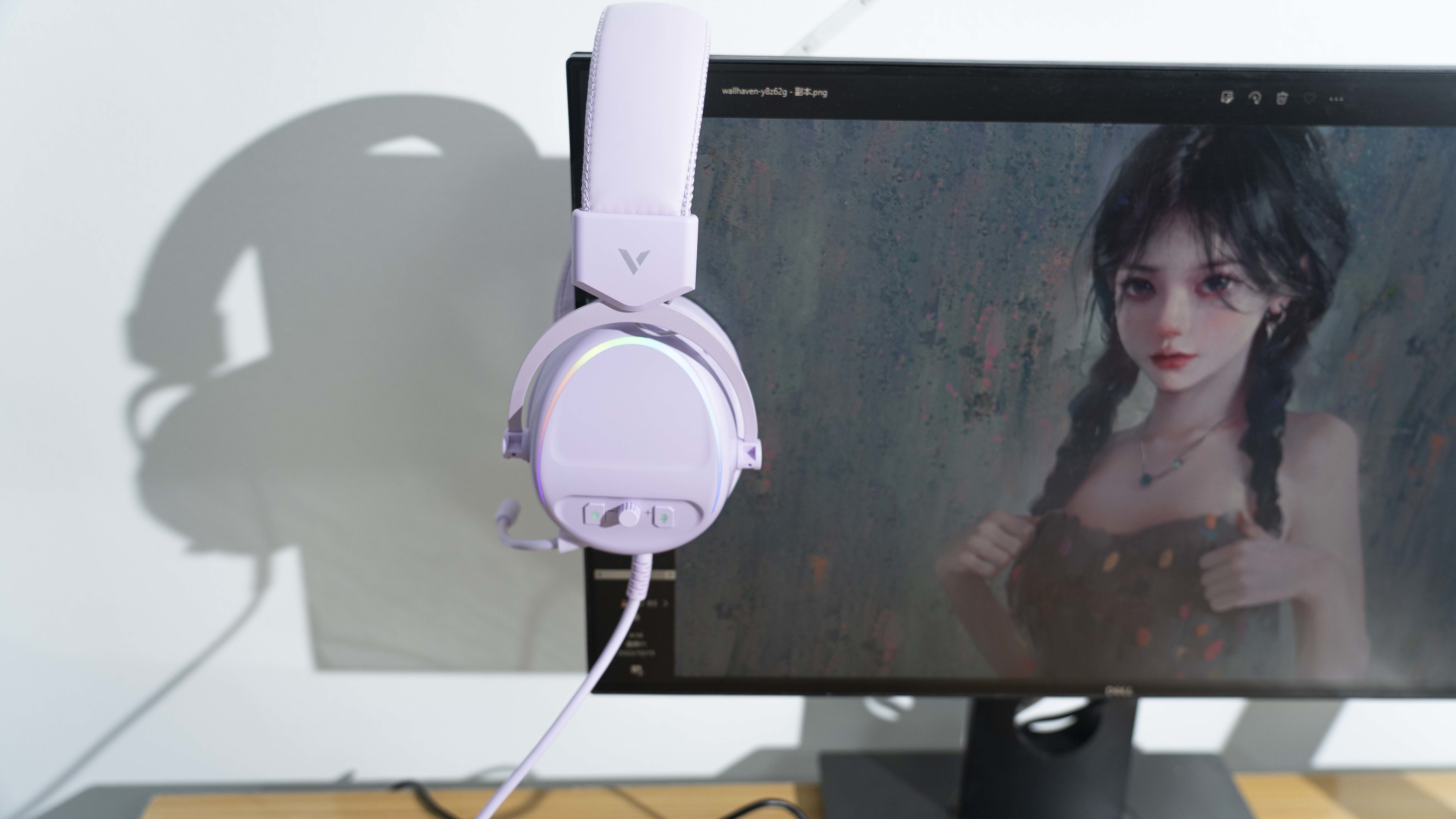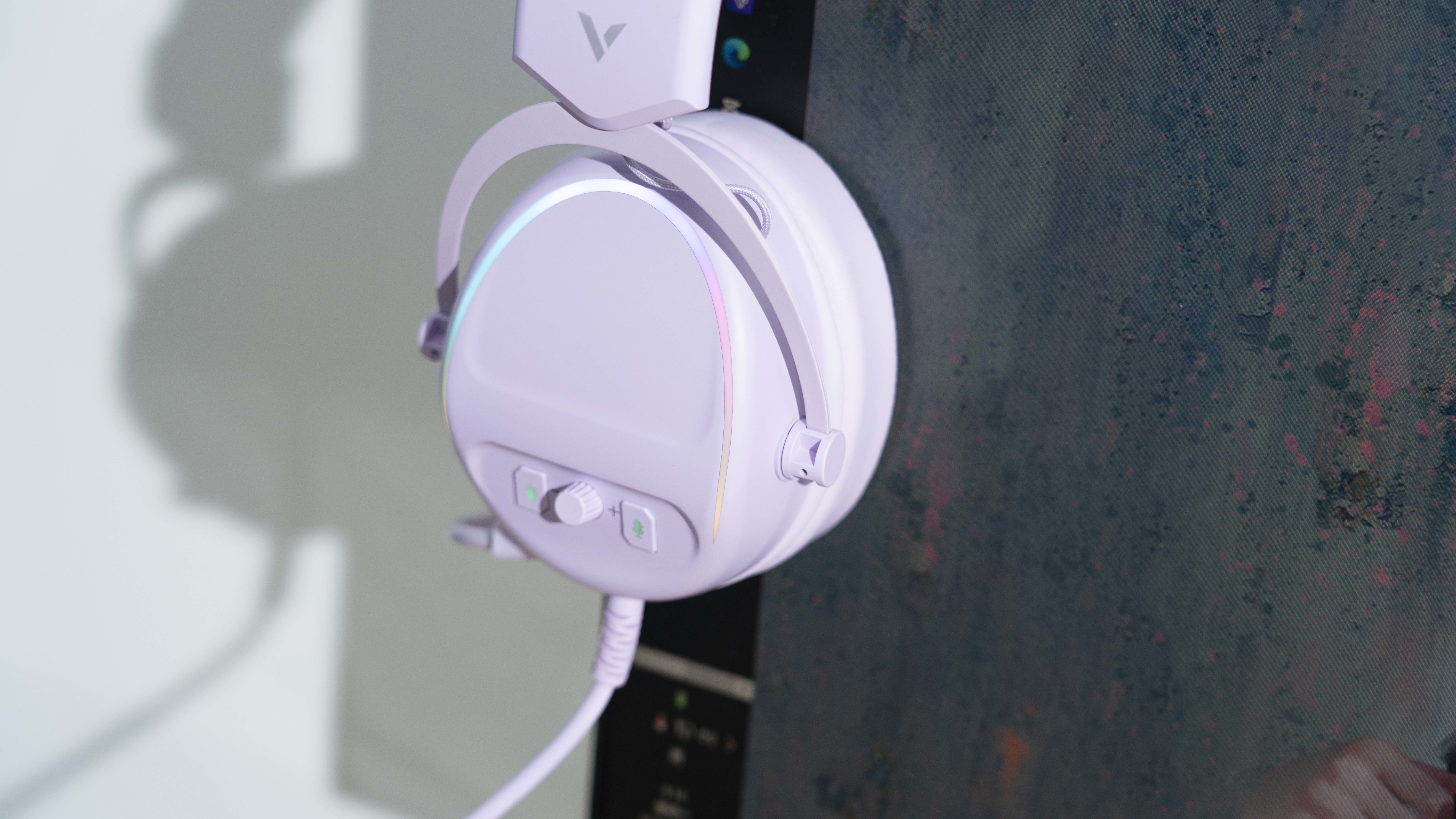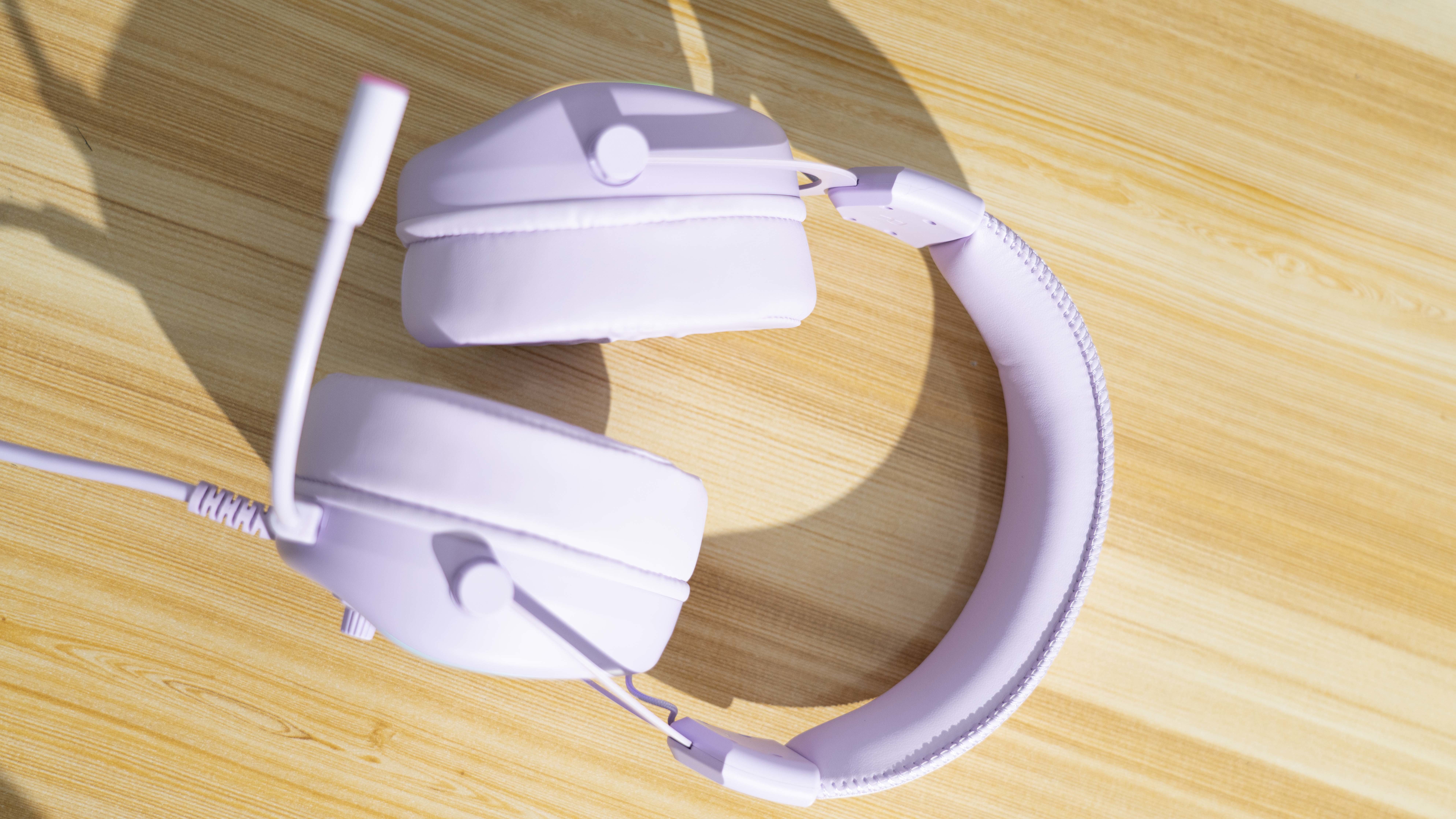全机身迷雾紫色,皮质有质感,很柔软,耳罩加厚,长时间佩戴也不压耳朵,耳机的侧面可以调节音量以及麦克风的大小,搭配上RGB灯效,夜晚更加绚丽多彩。