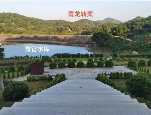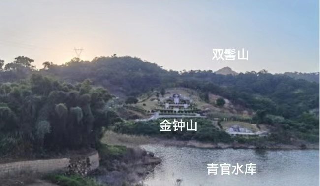 金钟山以双髻山为少祖,双髻山原属小北山的星系,龙脉蜿蜒逶迤,气势磅礴,起伏跌宕,龙脉行至金钟山结穴,峦头呈金钟形制,故称“丝线吊金钟”(见图二)。墓园前方是青官水库,青龙转案(见上图),开屏列帐,众水特朝。据文旅部门收集资料记载,该墓择周天283度,分金辛乙兼酉卯,周易旅卦二爻,变卦为鼎卦,此卦犯二黑病符星,理吉数凶。
