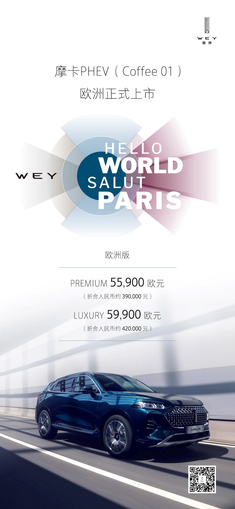 10月17日,2022巴黎车展正式开幕。魏牌以“HELLOWORLD,SALUTPARIS! (你好世界,你好巴黎!)”为主题,携新能源双子星摩卡PHEV(Coffee01)、拿铁PHEV(Coffee02)重磅登场,并宣布摩卡PHEV(Coffee01)正式在欧洲上市,售价55,900-59,900欧元(折合人民币约39-42万),与欧洲在售豪华车型相当,广受欧洲市场的接纳和好评。