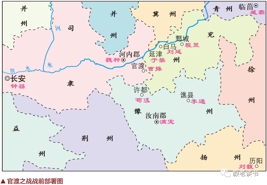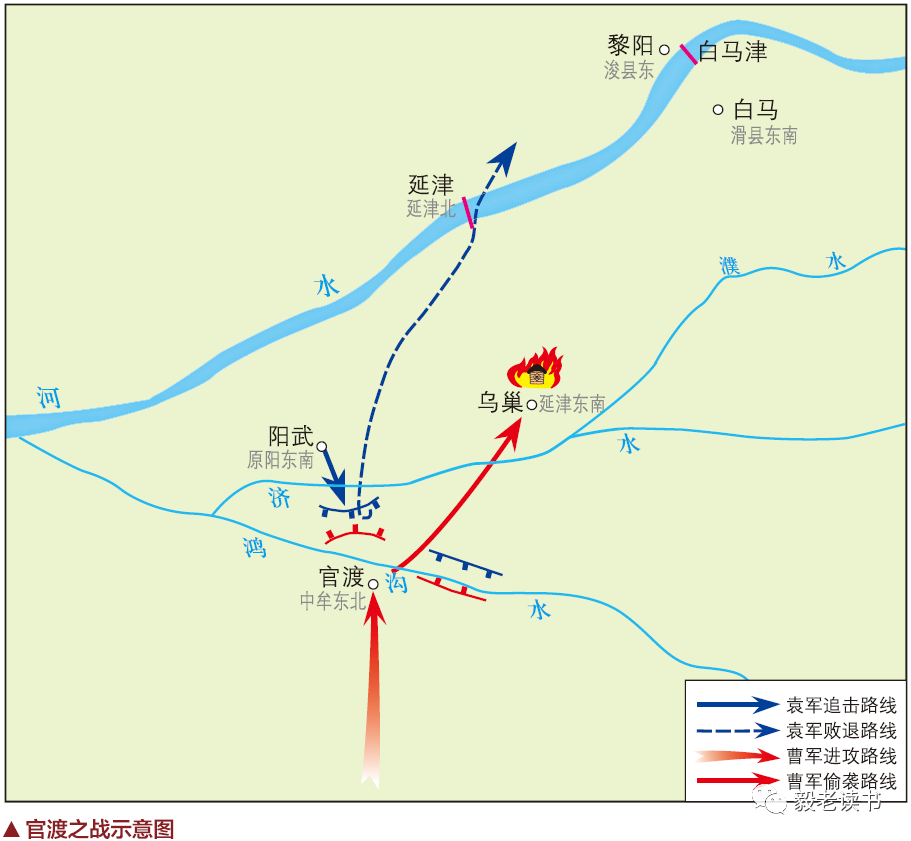 在军事史上,官渡之战是中国战争史上以少胜多、以弱胜强的著名战例,其过程冗长不再赘言。此战曹操客观上处于劣势地位,但他能扬长避短,采用正确的战略战术,使战争向有利于自己的方面转化。从曹操早年间用兵谋略就高度重视地理环境和战略格局的变化来看,曹操显然对地图的使用炉火纯青。否则,兵力和处境早先并不占优的曹操,无法统一北方,称雄天下。