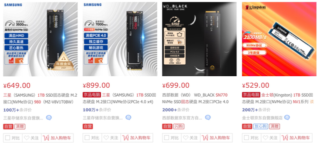 那么,同为PCIe3.0或PCIe4.0的固态硬盘,不同标称速度的产品真正性能有多大差异?用户又如何针对自己的主板和应用场景选择适合自己的固态硬盘?带着这些疑问我们挑选了四款颇具代表性且自带“流量”光环的产品来为大家做一个深度的对比测试,分别是京东销量前三的三星980、三星980 PRO、西部数据SN770以及热度颇高的金士顿NV1(价格均以京东自营旗舰店为准)。