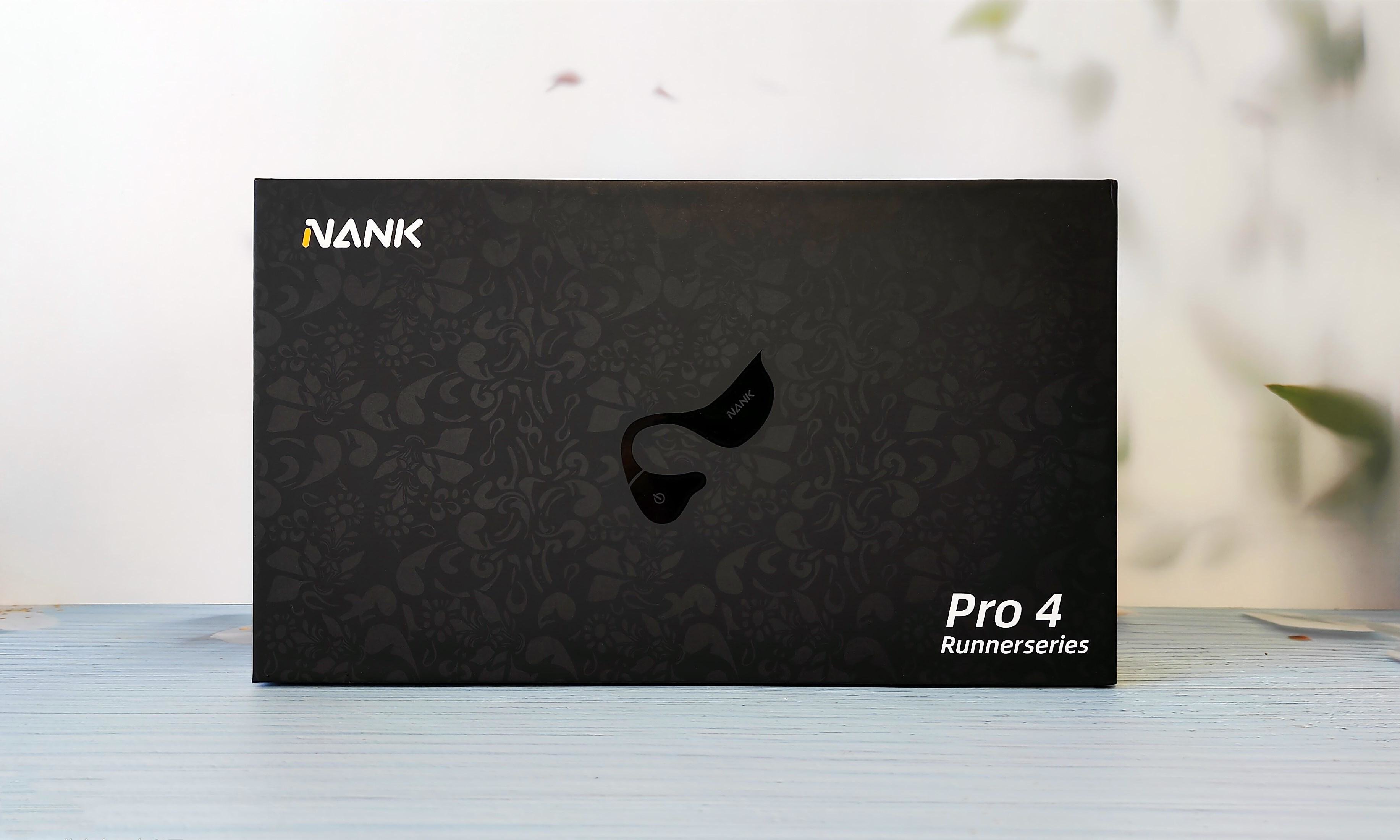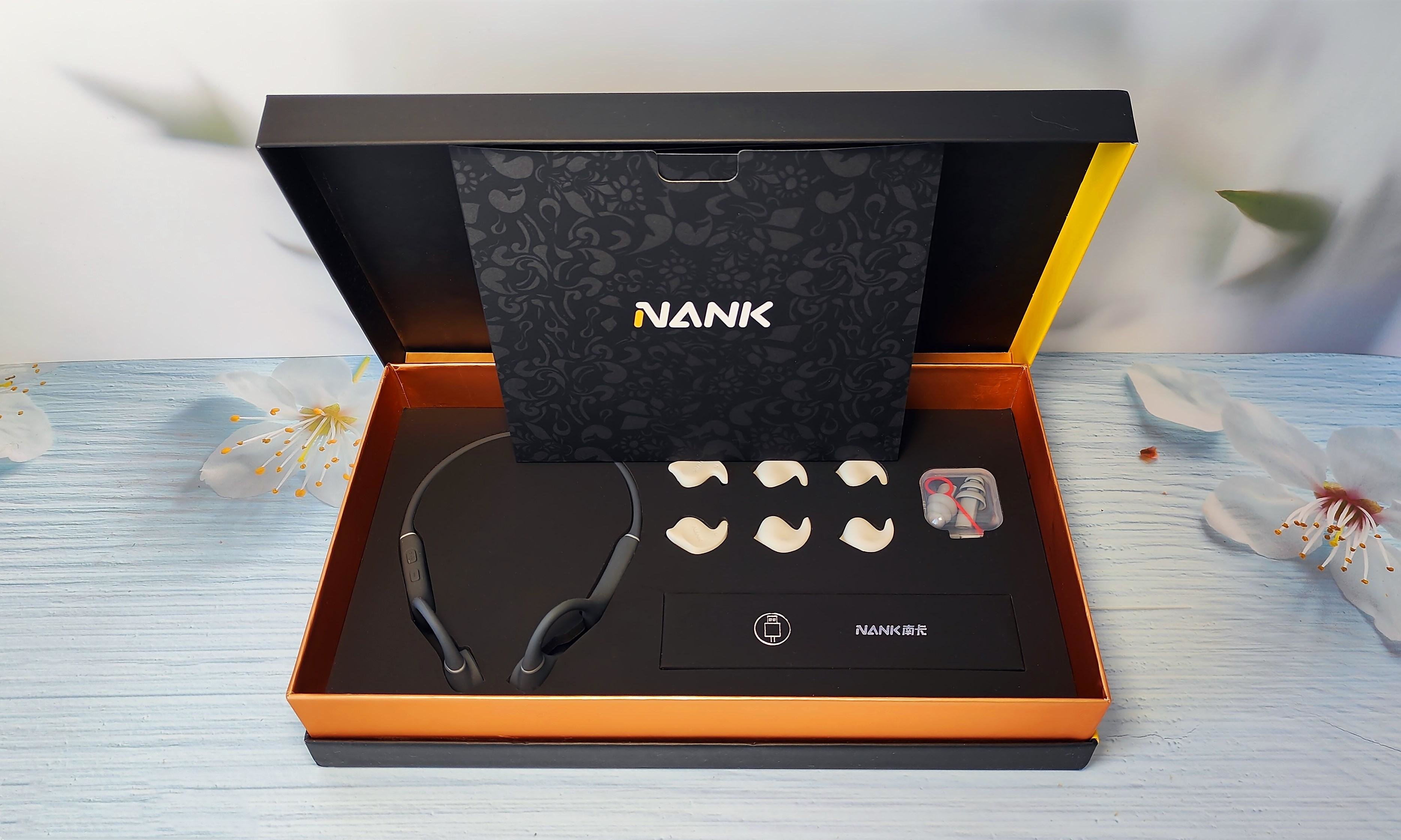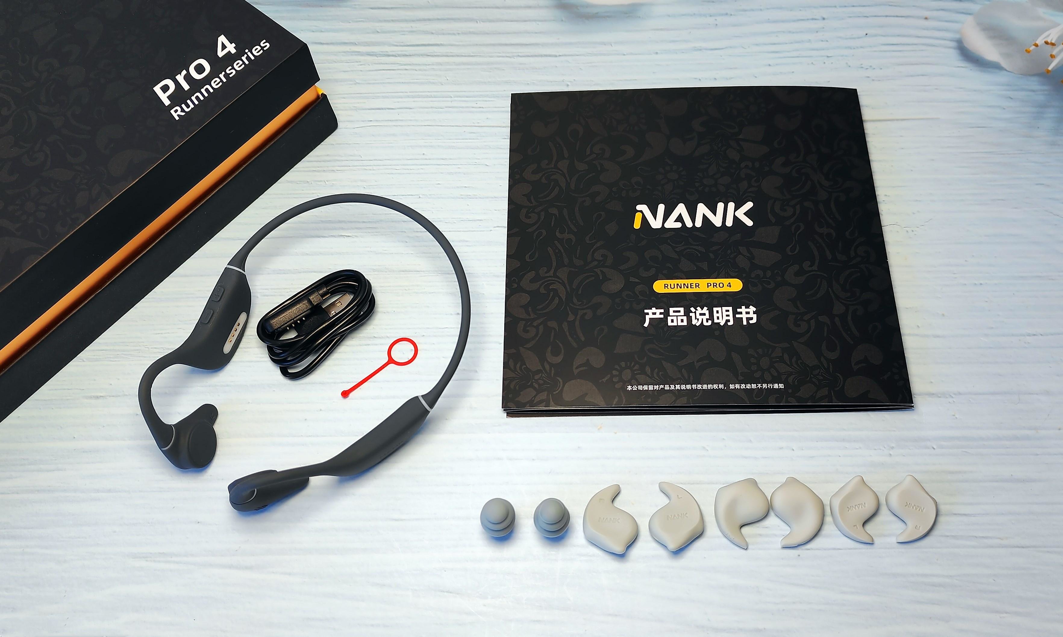 包装盒正面印有“NANK”品牌LOGO和产品型号Runner Pro4;盒子底面则是列举了耳机各项参数的铭牌信息。包装盒采用了掀盖式设计,盒内有一个黑色海绵托盘,骨传导耳机、音质增强器、耳塞等配件被固定在托盘的凹槽内,摆放规整、固定稳妥。