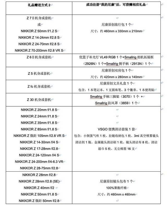 1)活动期间凡在参加活动的渠道,购买活动指定商品,成功注册“我的尼康”后,可获赠注册好礼。