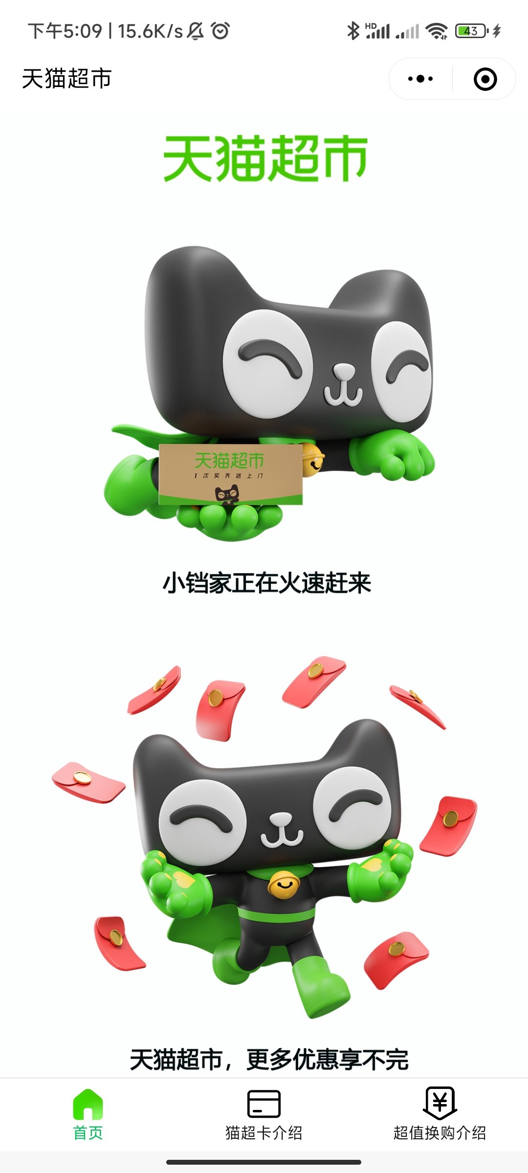 打开“天猫超市小铛家”小程序,主要是静态展示天猫超市的“猫超卡”,以及“超值换购”的介绍,首页并未同步天猫超市的购物页,看起来还并未正式启用。