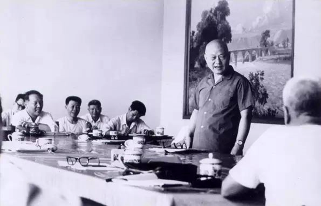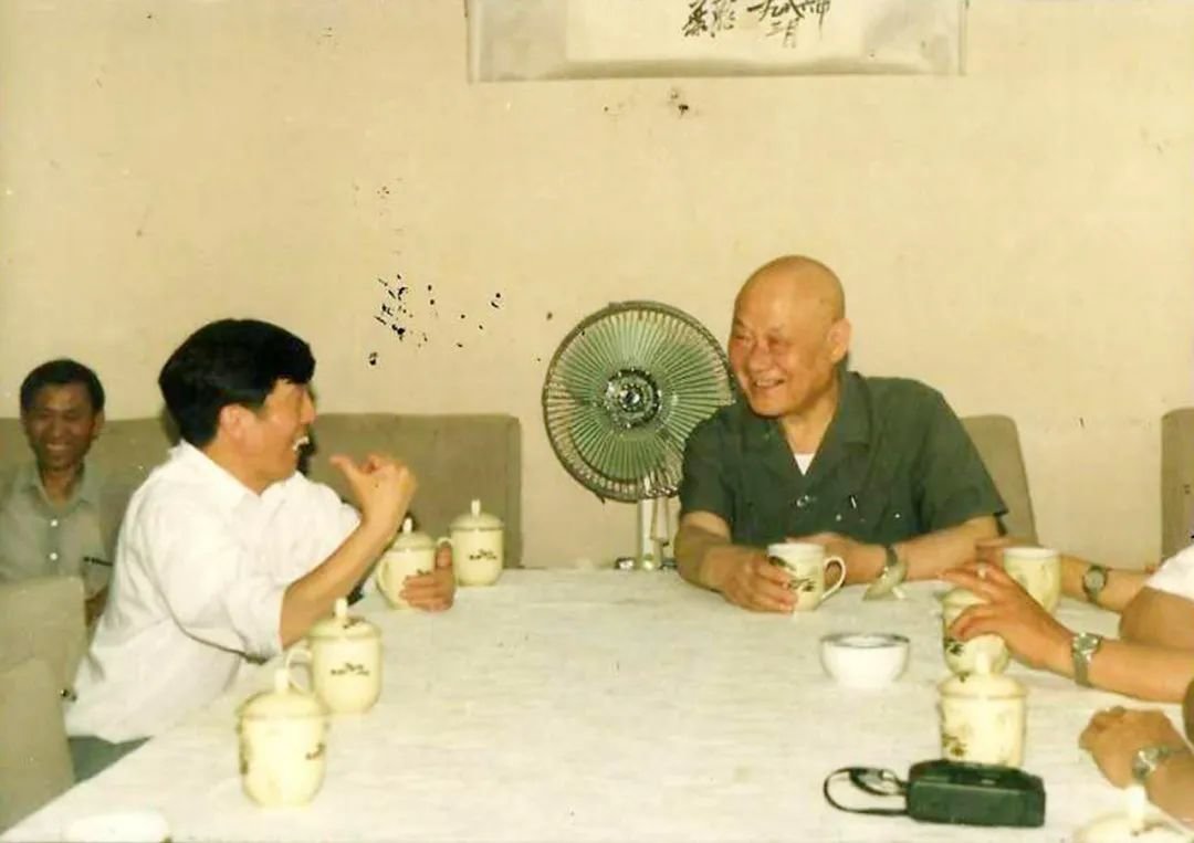 图 |20世纪80年代项南与作者(左)在福建省人民政府驻京办事处会议室亲切交流