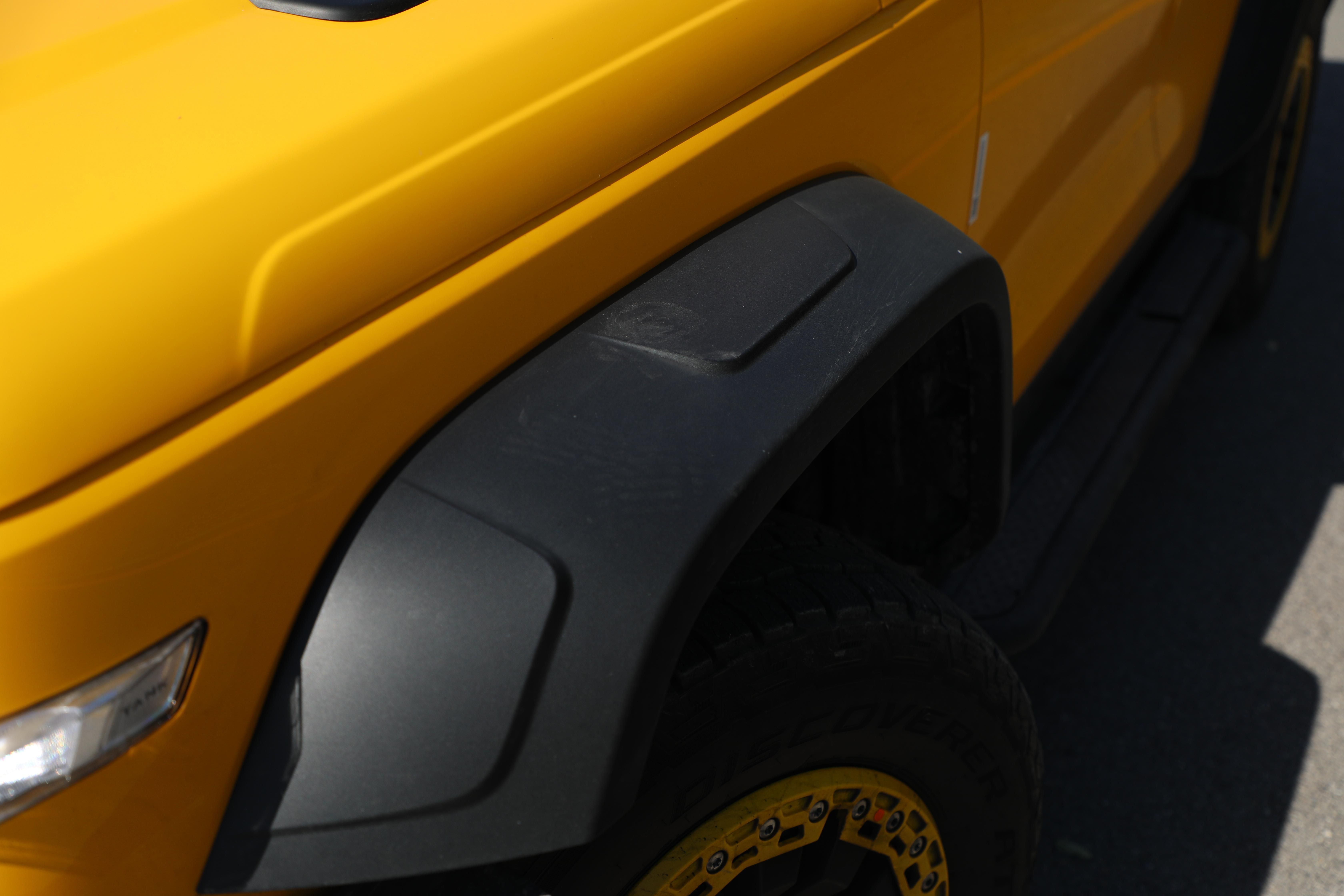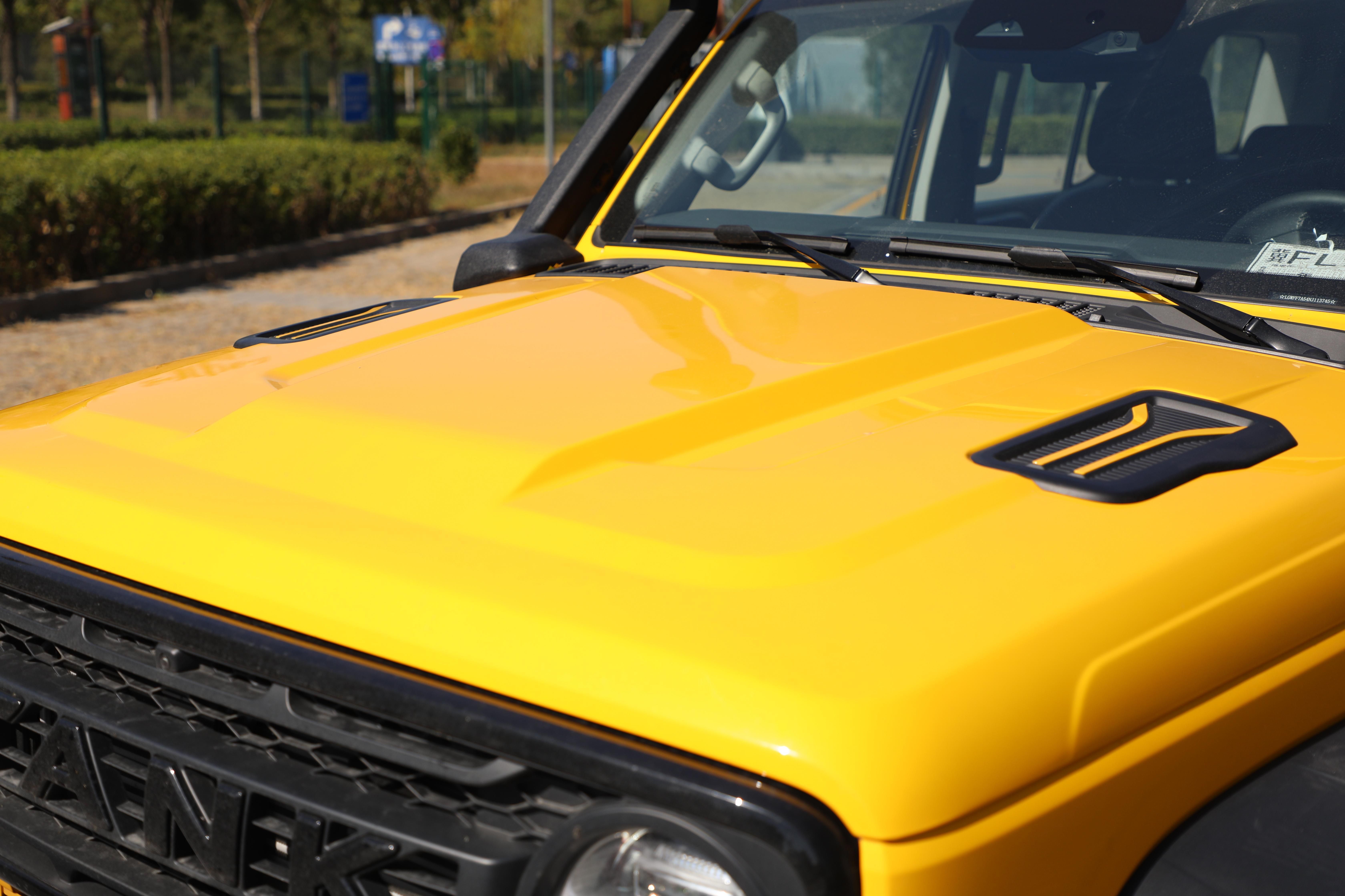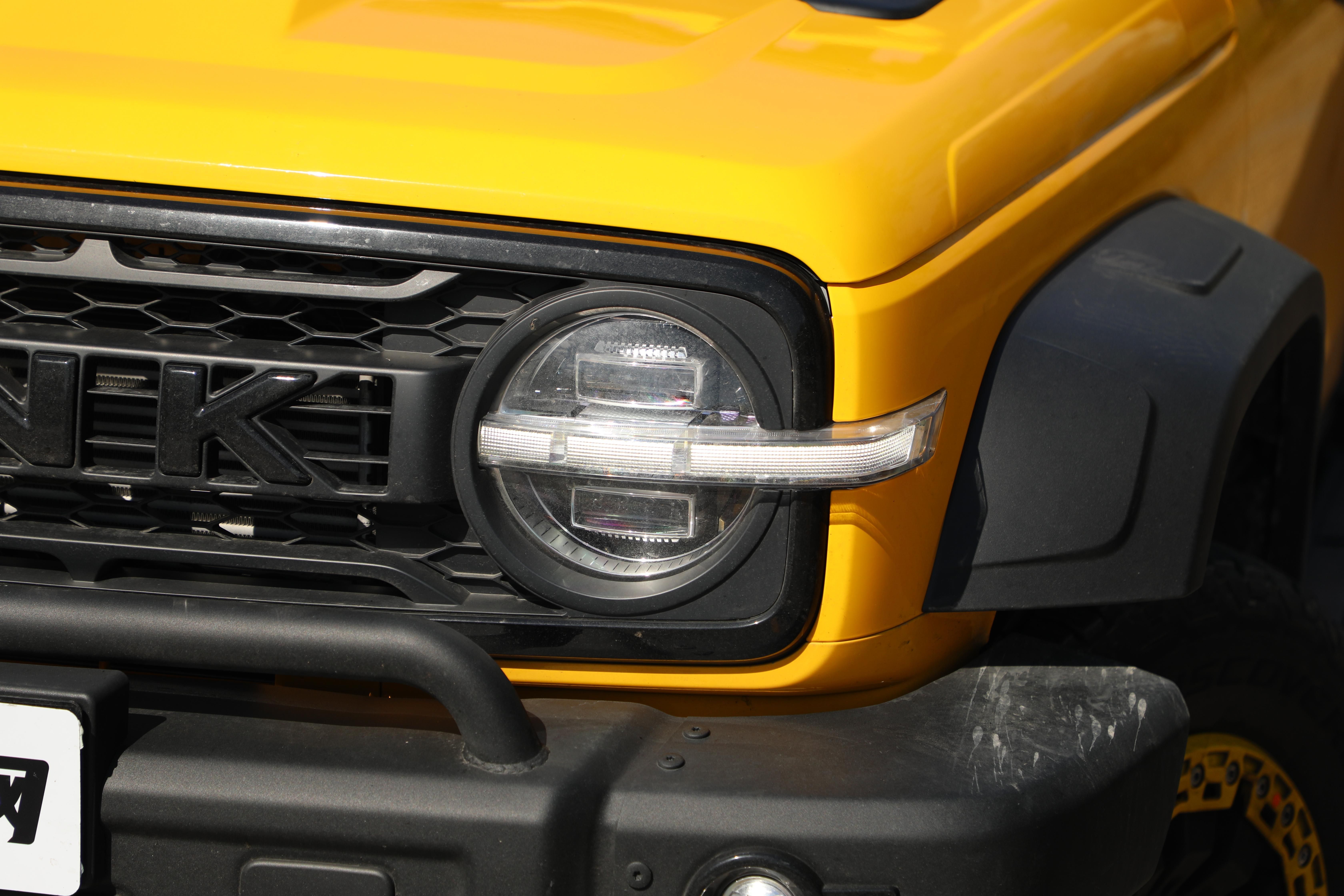 坦克300边境版拥有专属的黄金甲车漆配色,明黄色的车漆非常具有辨识度,整个车头最大的变化来自于前中网除了熏黑式格栅以外,格栅内部的品牌LOGO也被替换成“TANK”英文标识,个性十足。