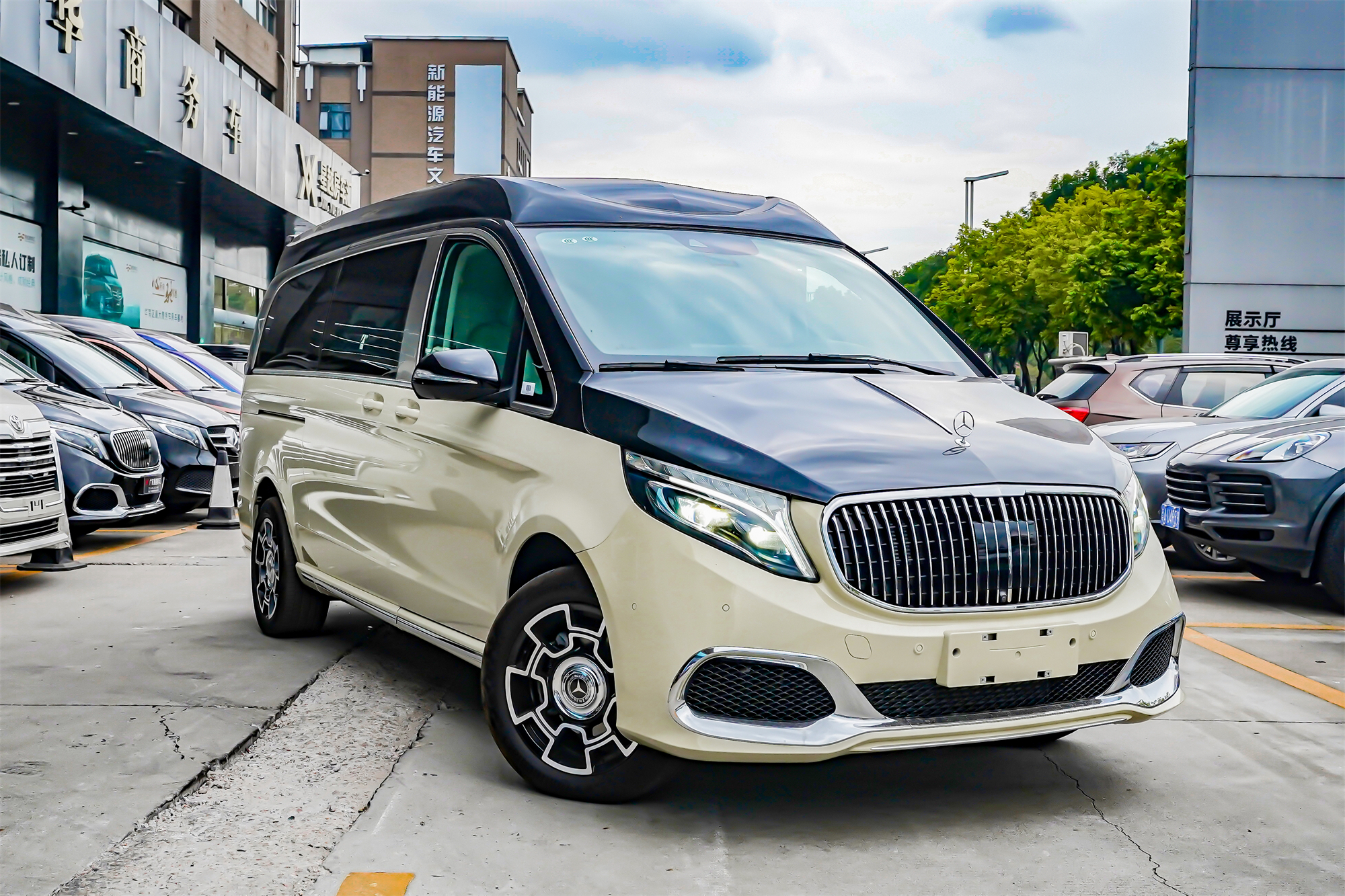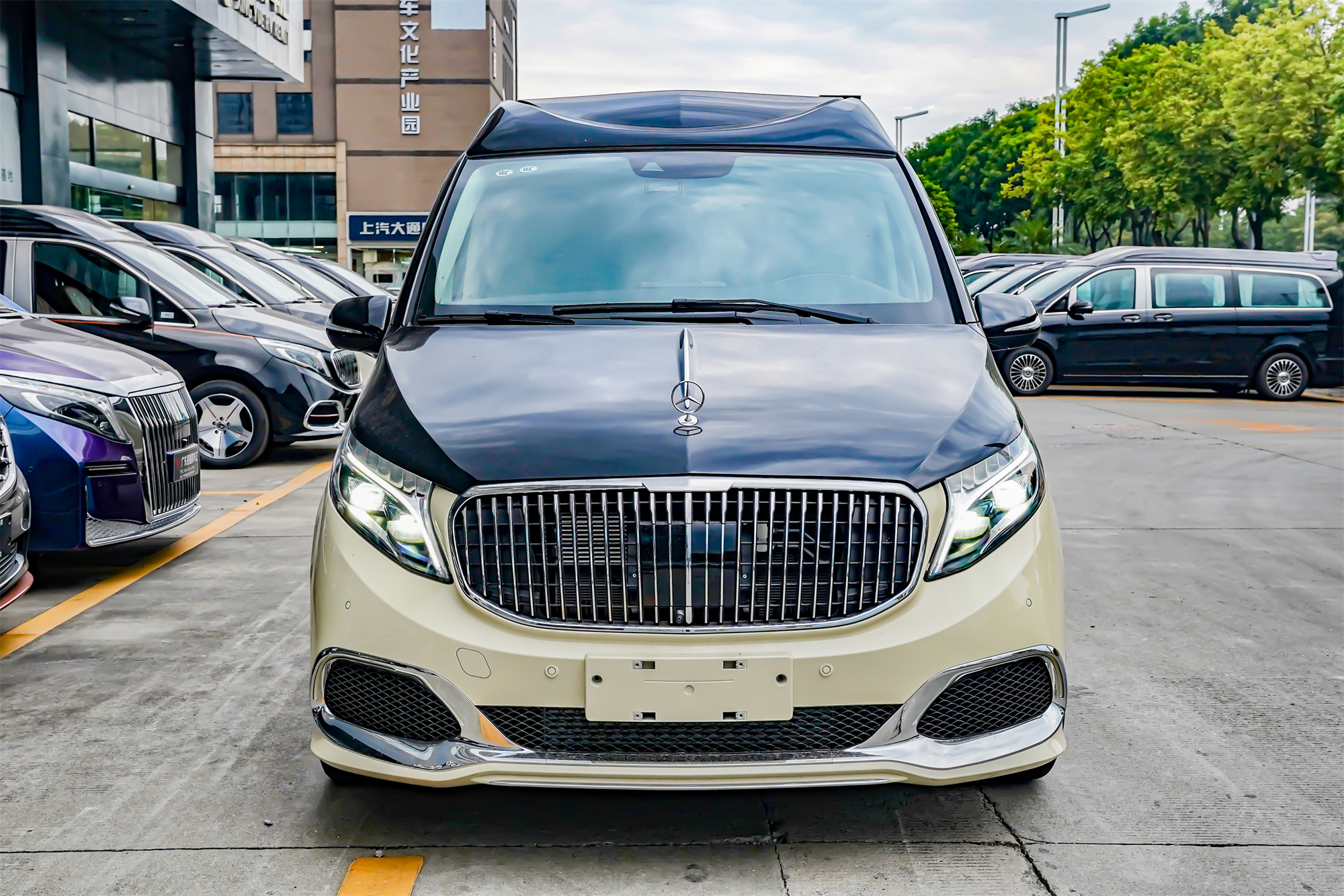 外观方面,奔驰VS980采用GLS最新款大包围,奶白+黑双拼色高顶车身,尊贵又有辨识度。奔驰立标,鹰眼大灯,镀铬车身,大饼轮毂,这才是高端商务车该有的样子。