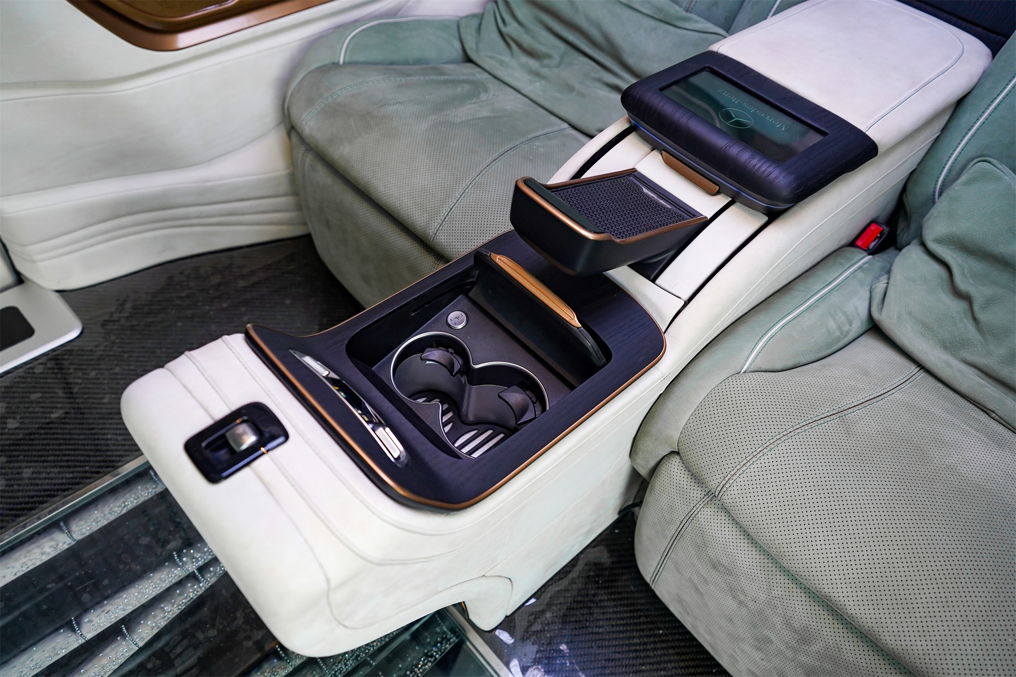 多功能扶手也是惊喜颇多,可展开两张航空桌板,还有电动酒柜、杯托、无线充电,液晶屏还能控制全车的电器,车内状况,尽在掌握。