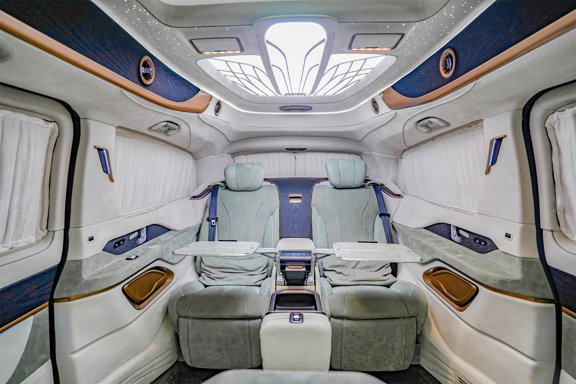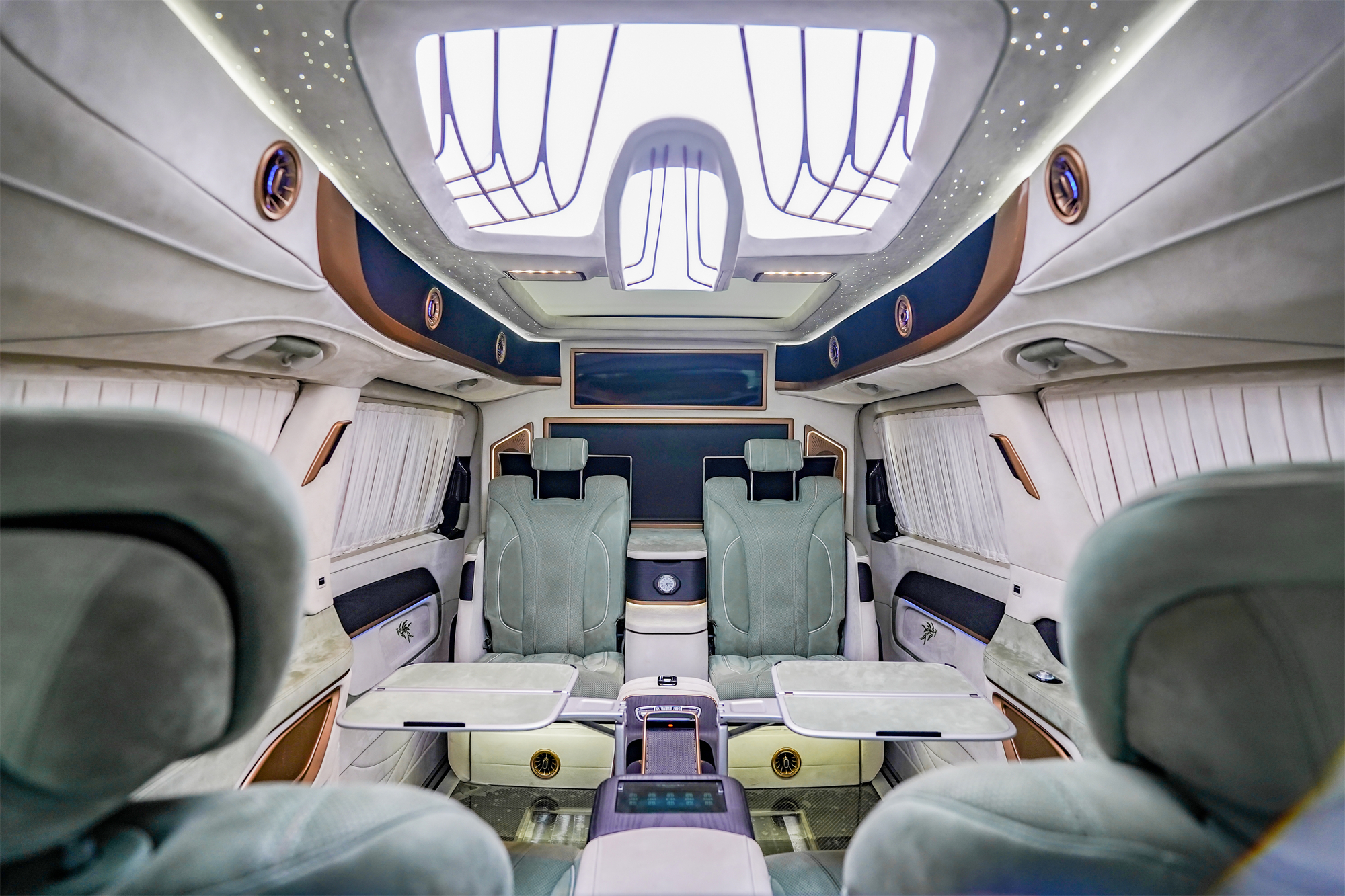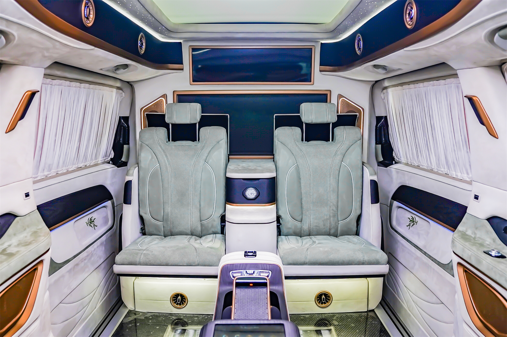 内饰方面,奢华升级。奔驰VS980全隔断四座版,中控台的哑光桃木与麂皮绒包覆,浅绿色+白色的色系,加以金色镀铬饰条点缀,奢华典雅不失高级感。