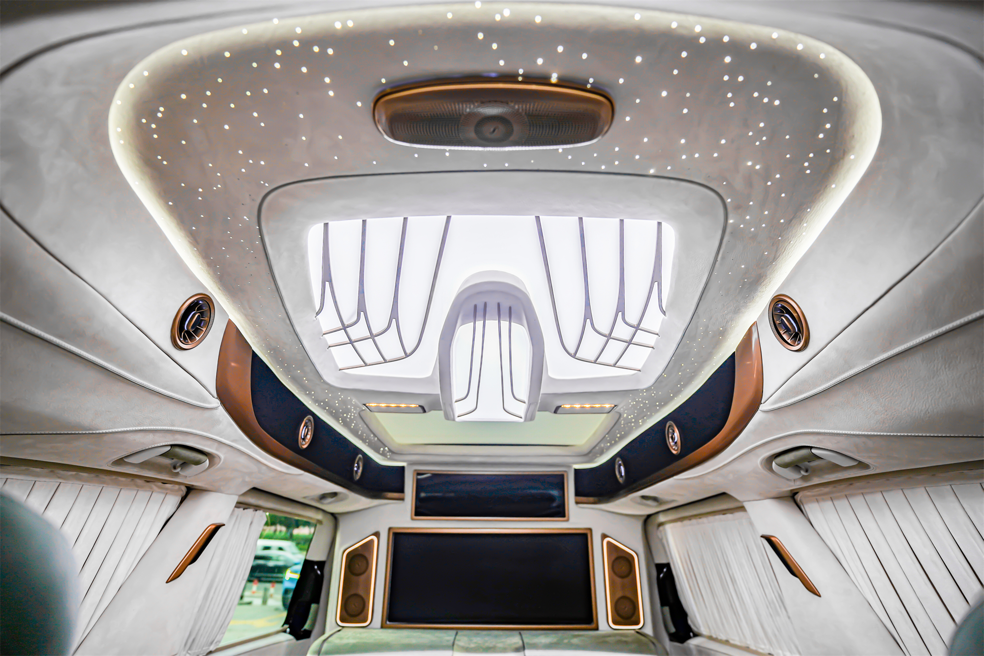 进入头等舱,一种高档奢华科技感扑面而来。多功能升降隔屏,前后舱分开,独立私密。搭配43寸曲面液晶电视、柏林之音环绕音响,带来媲美剧院般的视听享受。
