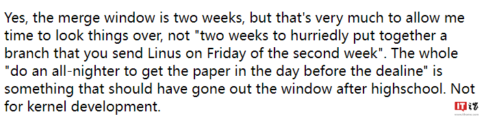 他表示,Linux 版本合并窗口本来有两周时间,可以让他有足够的时间审查补丁,但一些人总是在“第二周的星期五”才提交合并,这样类似于高中生赶作业的做法是不好的,应该在高中毕业后就改掉。