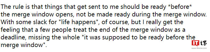 Linus 接着表示,开发者应该在 Linux 内核合并窗口开启前就准备好补丁,而不是开启后才开始准备。他明白每个人都会有懈怠的时候,但不应该每次都把合并窗口关闭日期作为 deadline。