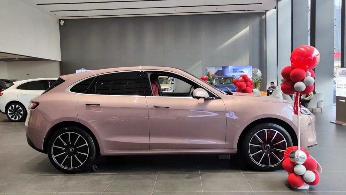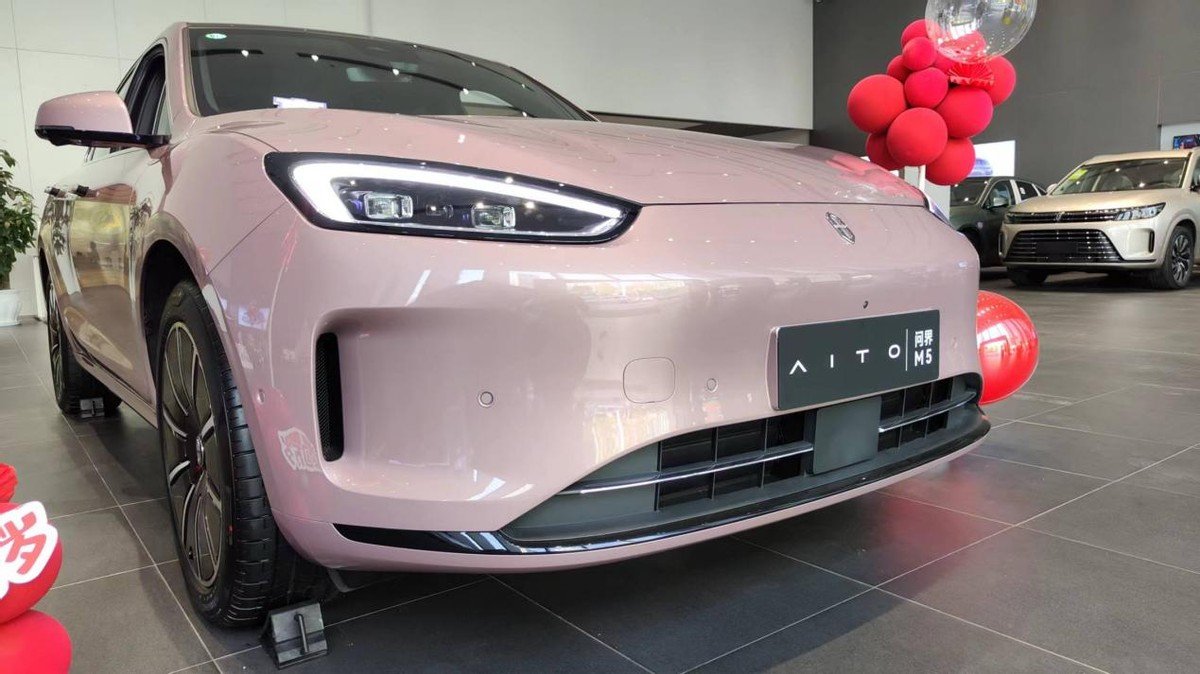 那么从实际现场效果来看,是不是能够达到“最美”的程度先放在一边,笔者见到的这台拂晓粉配色的问界M5 EV,对视觉的讨好还是能轻松感知到的。比如正面上整体感加强的全封闭前脸、隐藏在保险杠中进气口的镀铬装饰、矩阵式设计的LED大灯等,要比增程版本给人以更强的科技属性和档次氛围,当然也能提高辨识度以及彰显纯电身份。