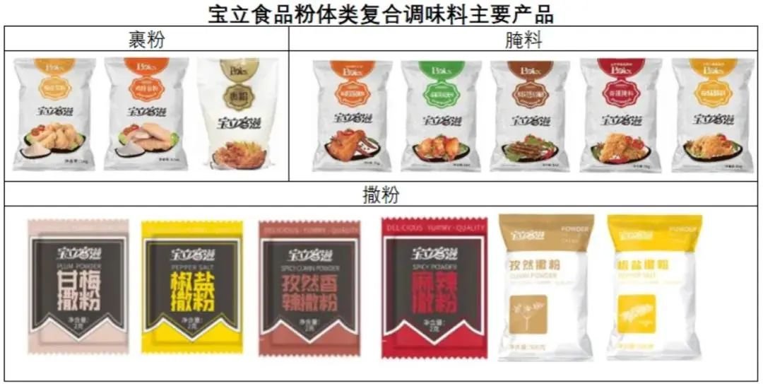 从产品构成来看,宝立食品的产品主要包括复合调味料、轻烹解决方案和饮品甜点配料三大类,各主业近年来均保持了良好的增长态势。其中,复合调味料主要包括粉体复合调味料和酱汁类复合调味料两大品类,是公司营收规模最大的品类,常年营收占比在50%以上,也是公司长期立足于行业的核心业务。