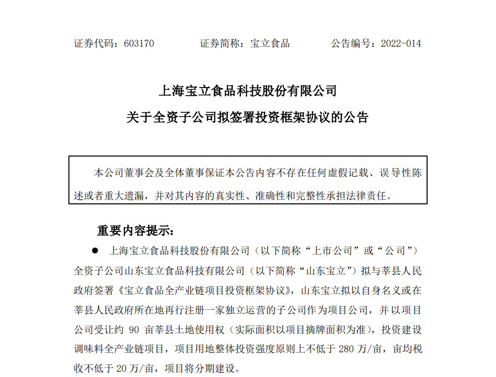 10月14日公告,全资子公司山东宝立食品科技有限公司拟与莘县人民政府签署《宝立食品全产业链项目投资框架协议》,山东宝立以自身名义或在莘县人民政府所在地再行注册一家独立运营的子公司作为项目公司,并以项目公司受让约90亩莘县土地使用权,投资建设调味料全产业链项目。按照现目标用地面积及投资强度指标测算,分期建设全部完成后预计总投资规模约为2.5亿元。