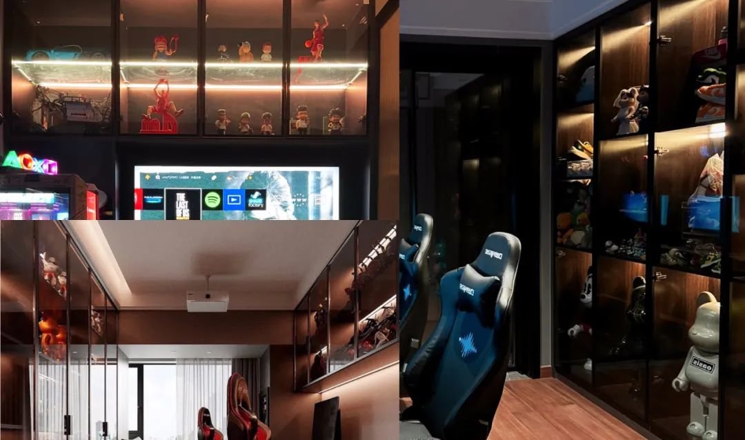展示区是电竞房的次要功能,因为电竞房设计的核心更强调的是氛围,而展示区通常会利用洞洞板、隔板置物架来收纳,洞洞板上一般收纳游戏所用到的一些基础设备,比如游戏手柄、耳机等等,还有其他的一些展品和杂物。