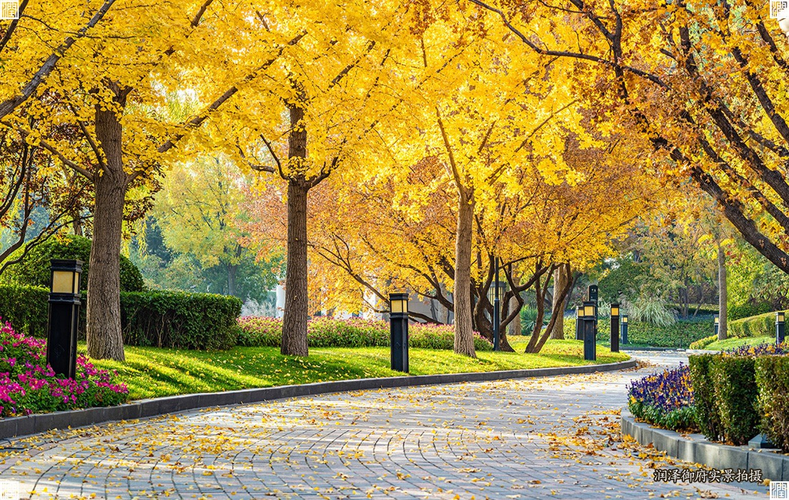 “文杏裁为梁,香茅结为宇”,墅区中的银杏,如挺拔的仪仗,迎接业主归家。一至秋临,满眼金黄,犹似飞舞的蝴蝶,映耀阳光,伴着阵阵秋风,流淌着古意的浪漫。金黄是秋日为御府沾染的第一个颜色。
