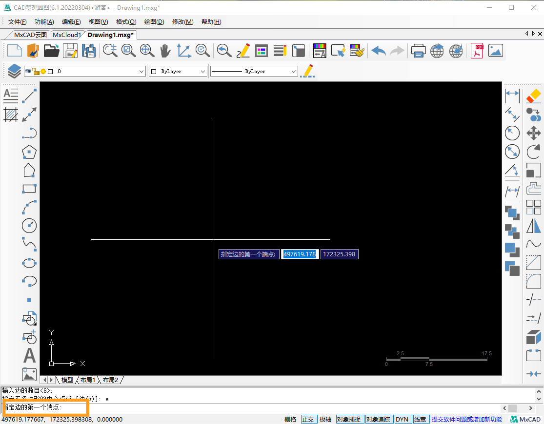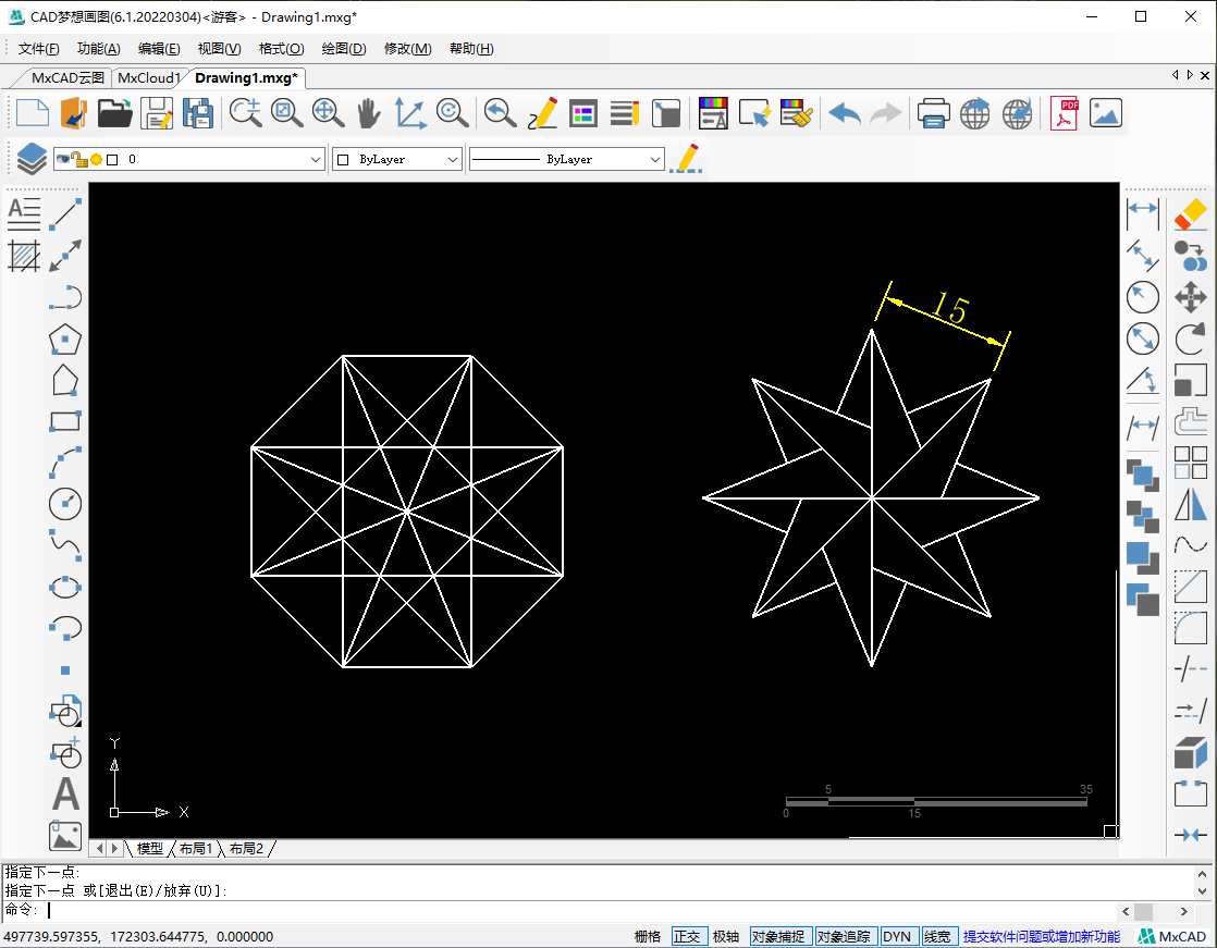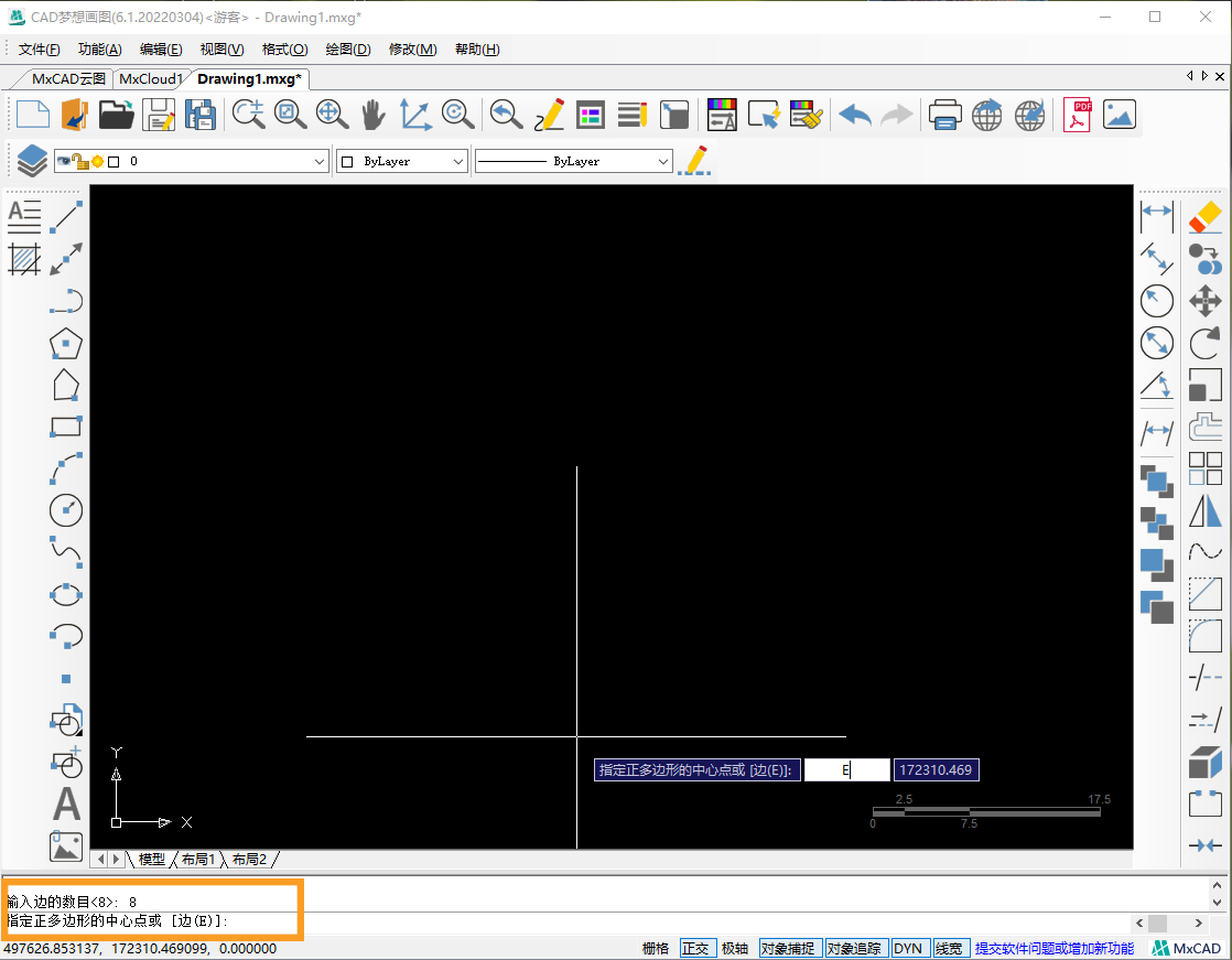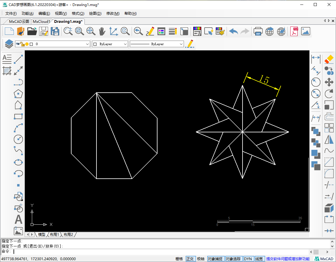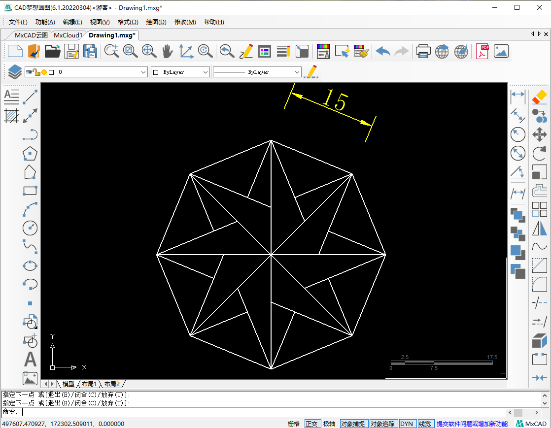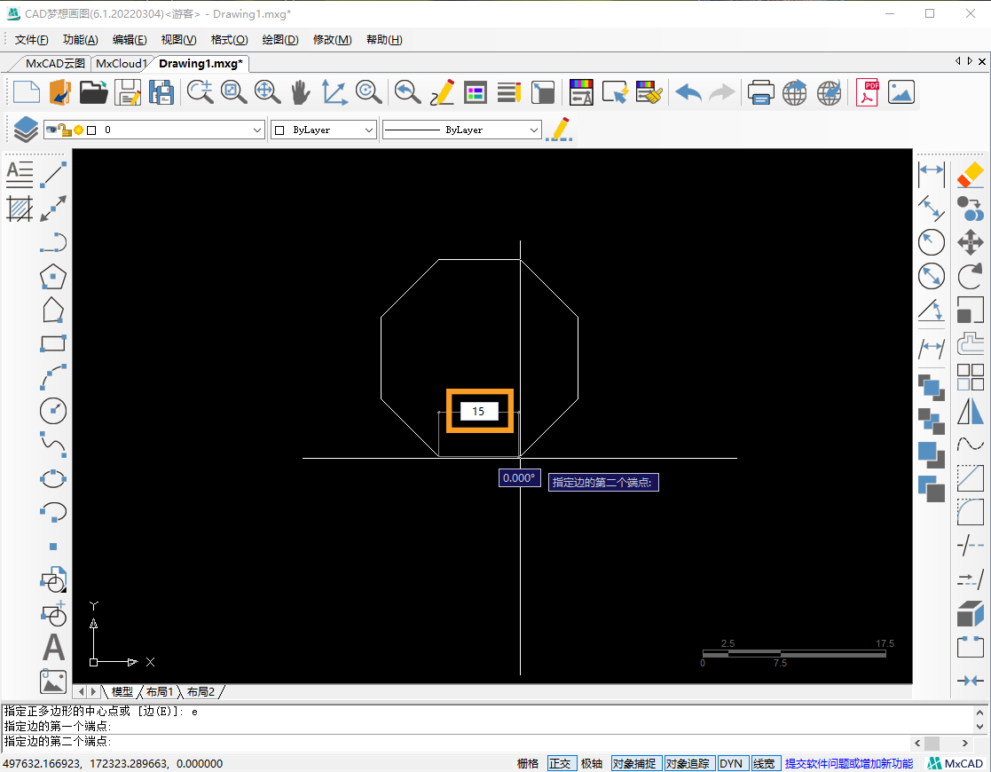 3.接着在命令行输入“E”,选择指定正多边形的边。空格后,指定边的第一个端点,再输入边长为15,指定第二个端点,按下空格,正八边形绘制完成。