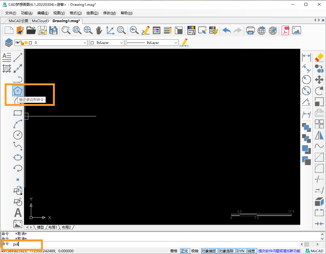 2.接下来我们使用CAD多边形命令,点击CAD软件界面左侧的多边形按钮,或者输入命令快捷键“POL”,按下空格,进行下一步。根据提示输入边的数目为8,空格。