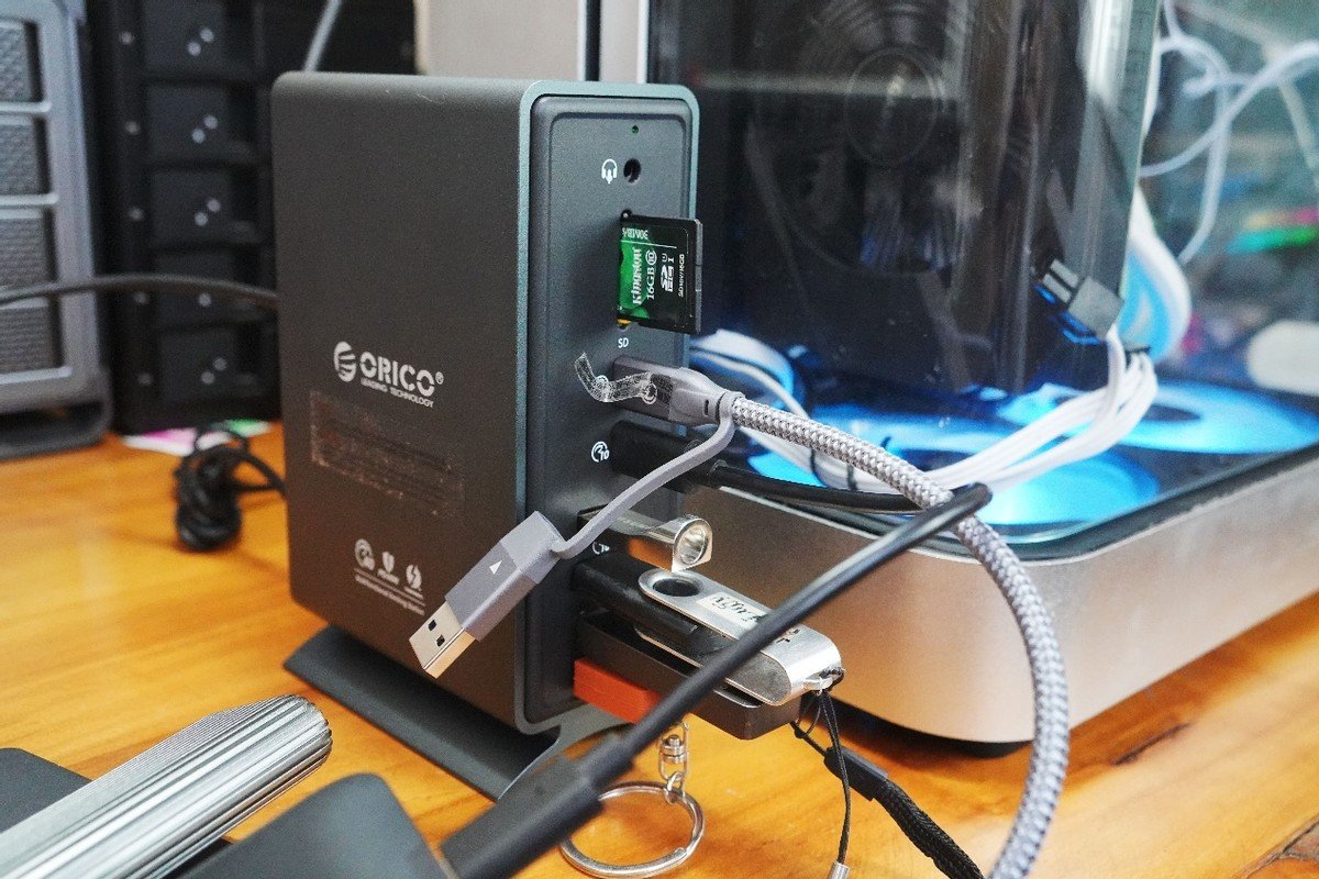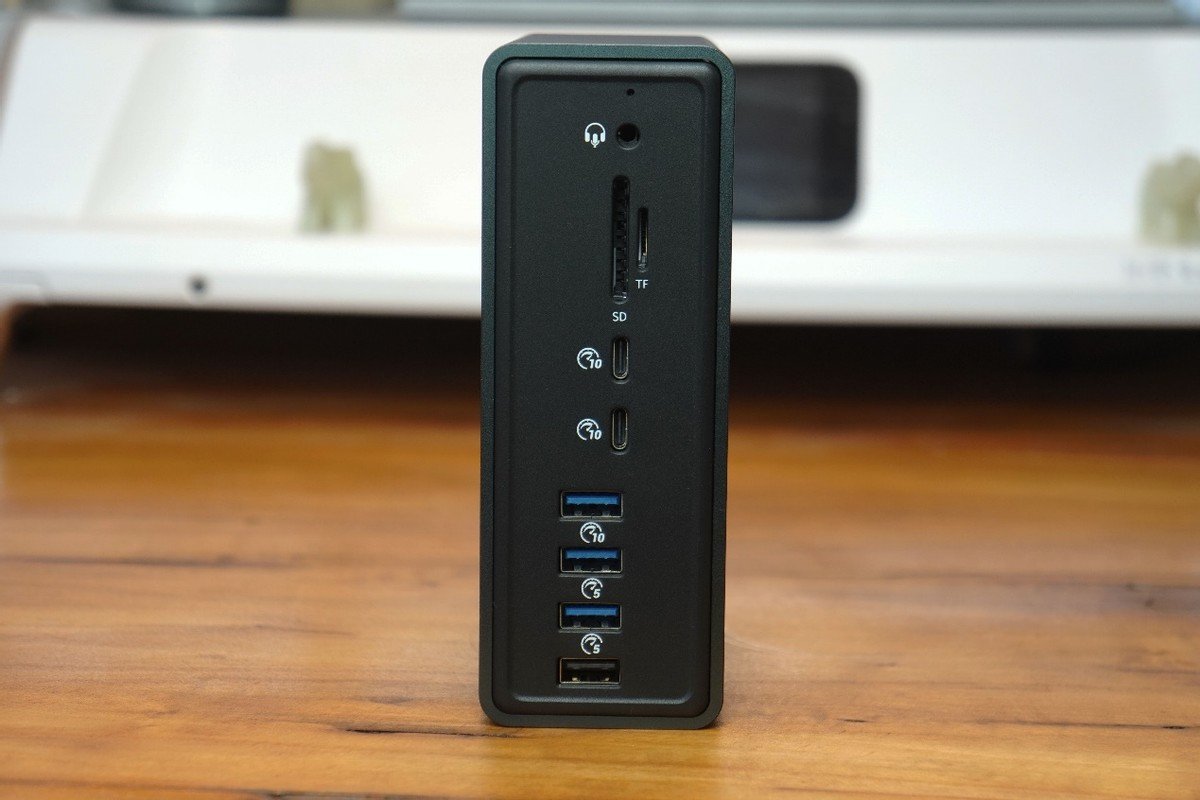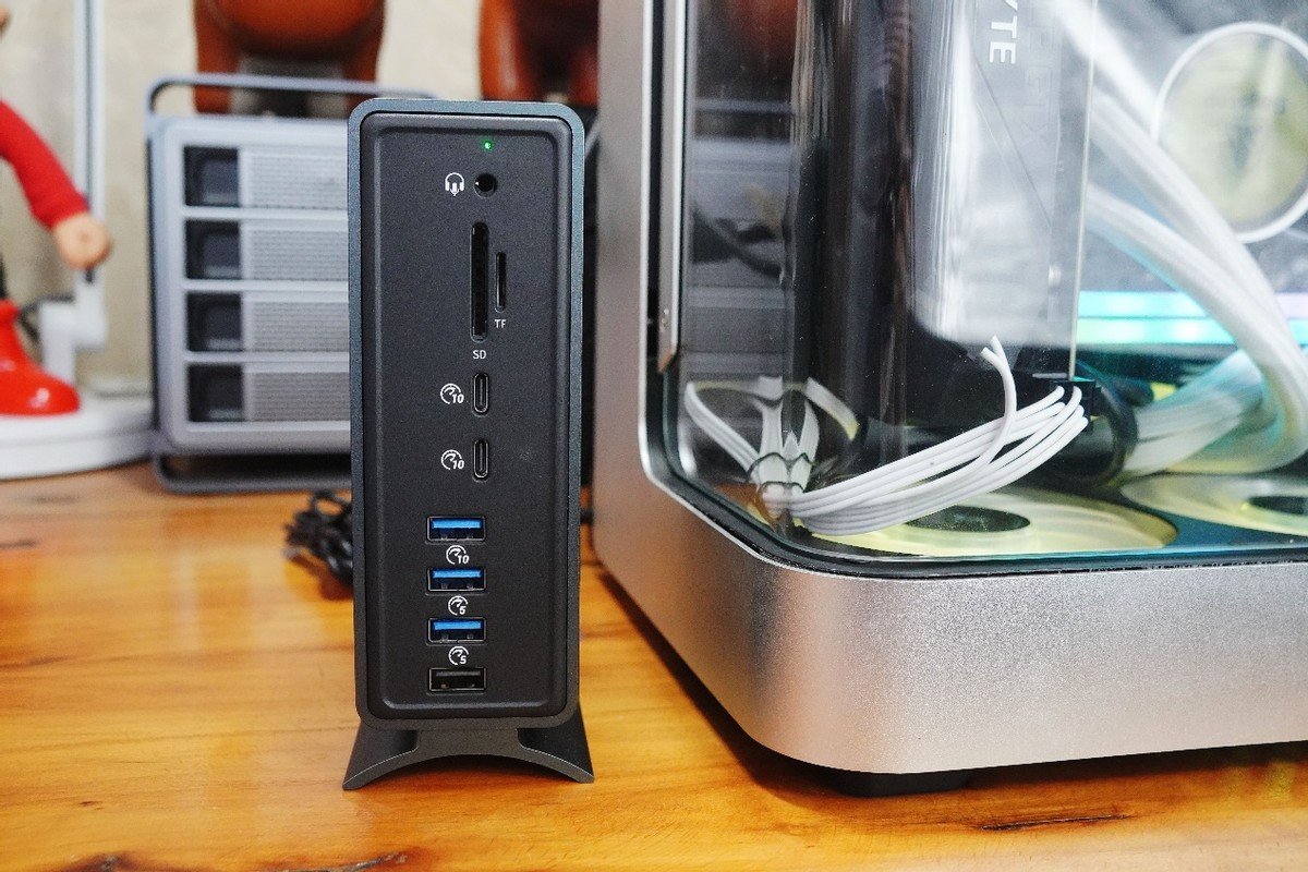 下图就是接口插满设备的效果图。我感觉比较值得一提的是,奥睿科15合一雷电扩展坞TB3-S4的TF卡槽和SD卡槽可以实现双卡槽同步读取存储卡,对于那些需要同时读写TF卡和SD的用户来说更为实用。