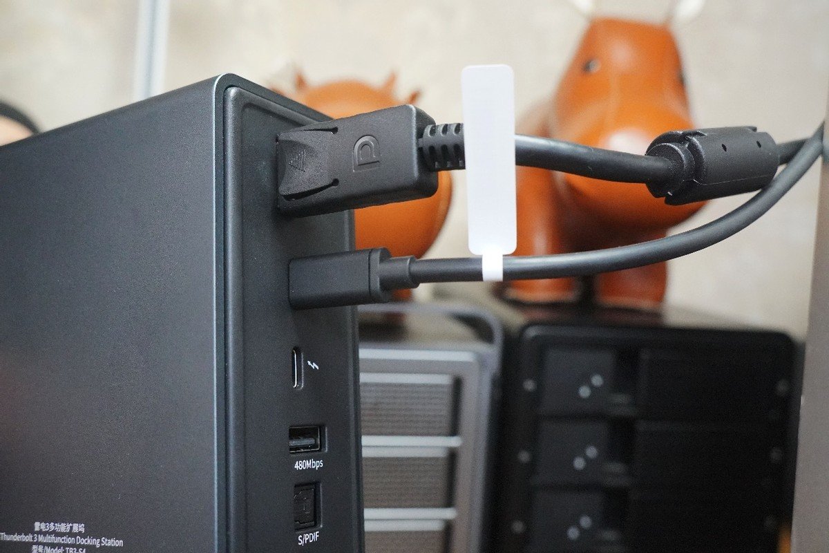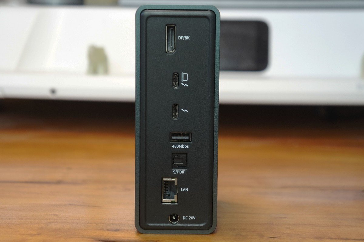 后方提供了1个最高支持8K输出的DP接口;2个雷电3接口,1个USB2.0规格的USB-A接口,1个S/PDIF音频接口,1个自带指示灯的RJ45千兆网口和DC供电接口,千兆网口的加入让一些不带有线网口设计的雷电设备实现更加稳定的有线连接。