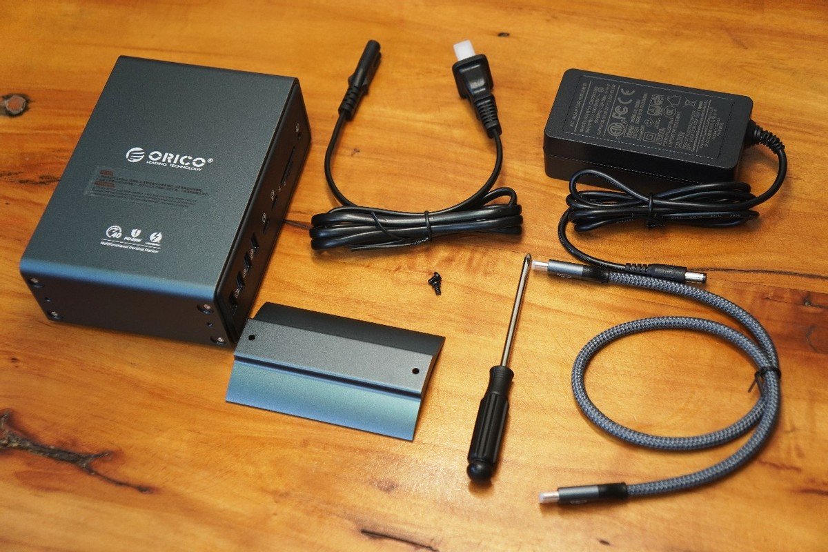 先来看看包装内物品,包含了一台奥睿科15合一雷电扩展坞TB3-S4,一根51.5厘米长的雷电线,一把螺丝刀,两颗固定底座的专用螺丝和电源适配器。电源适配器采用了跟笔记本电源相似的设计,奥睿科15合一雷电扩展坞TB3-S4功耗更大、功能强大,需要大功率电源适配器才能满足,实际输入电流为20V~3.25A。