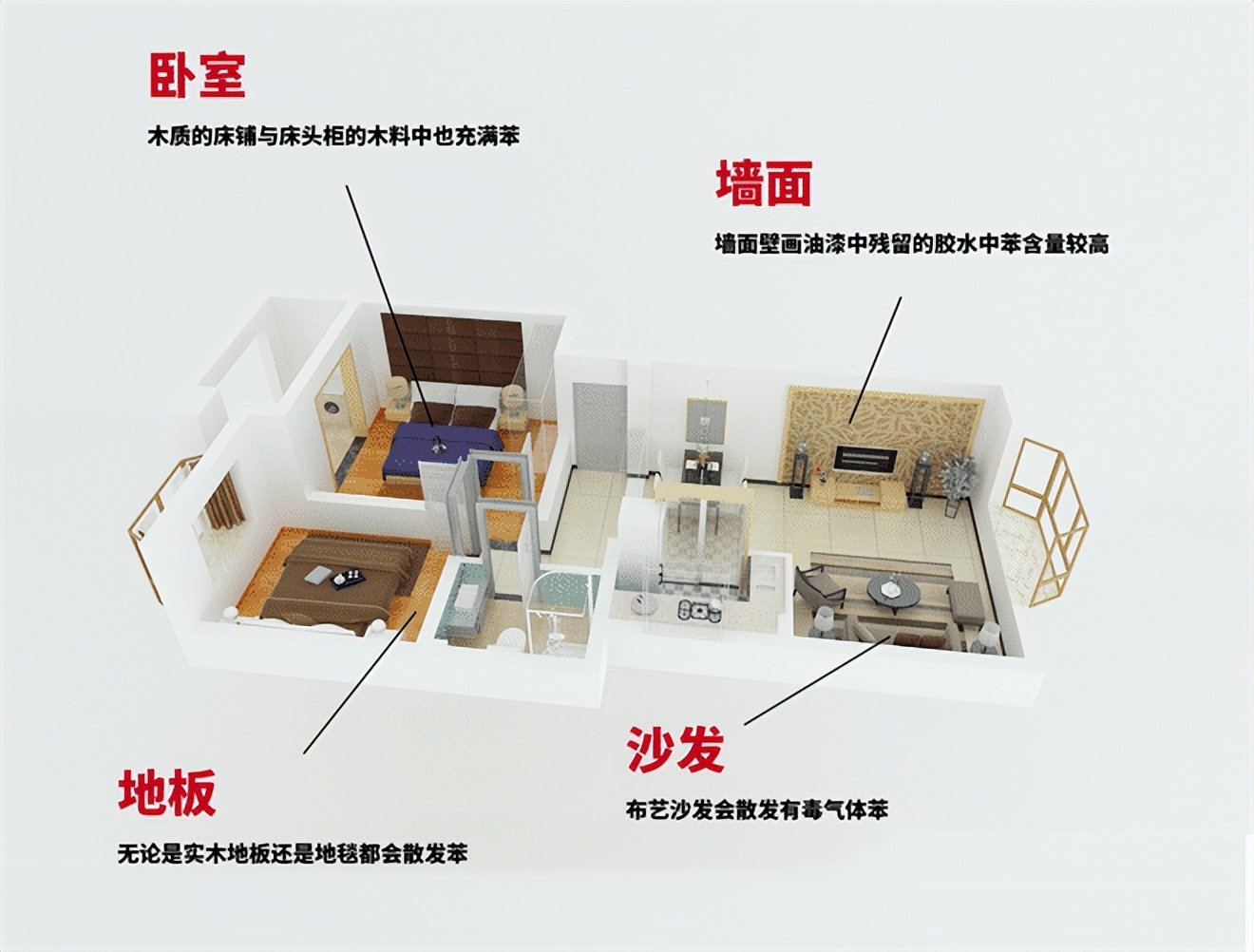 所谓“无苯不成漆”!各类油漆涂料中的主要成分就是苯系物,这也是它的主要来源!除此之外,还有合成纤维、塑料、橡胶等物品中也会含有苯系物。