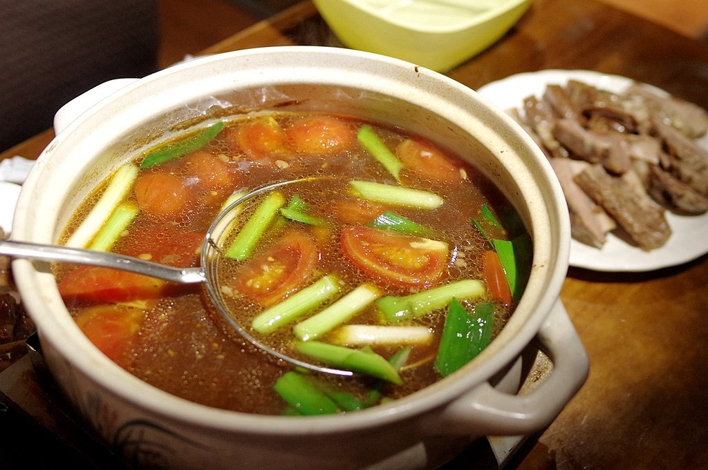 青蒜苗和红番茄搭配,除了为沉闷的卤水汤增添亮色,在味觉上最重要的贡献是提供卤水最忌讳的“酸”味。