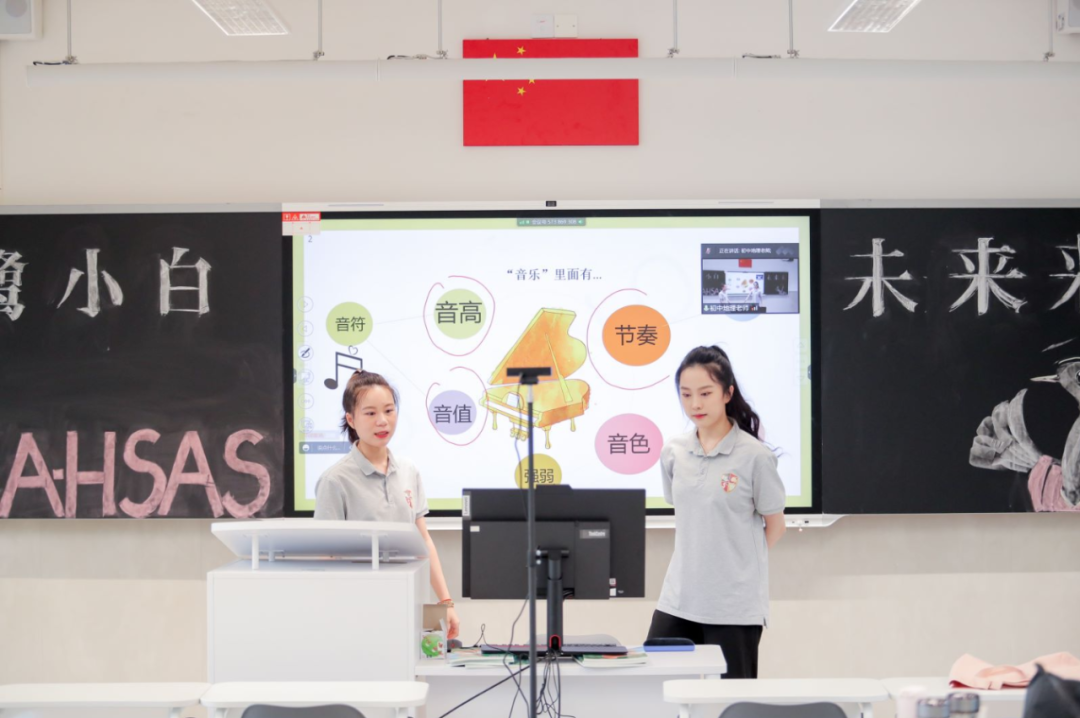 目前,特色融合课程在已经在学校得到初步实践,“学校初中七年级开设了将音乐和舞蹈融合在一起的特色融合课程。通过音乐、舞蹈课程的融合,让学生从特色乐器、声乐曲、器乐曲,再到各大民族的文化、历史服饰、舞蹈都全部了解,最终让学生能够从生活中发现音乐和舞蹈的元素。”音乐老师王志来、舞蹈老师郑佳琪现场分享道。