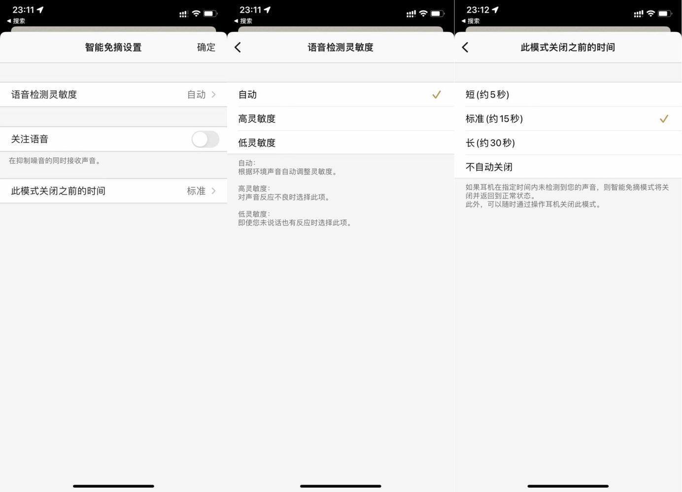 APP中,可以调节灵敏度、自动恢复降噪的时间,也可以选择关注语音,这个功能开启之后会大幅降低对人声的降噪,在办公室里面佩戴不会错过与别人的交谈,同时还可以将一些环境音给过滤掉,非常合适。