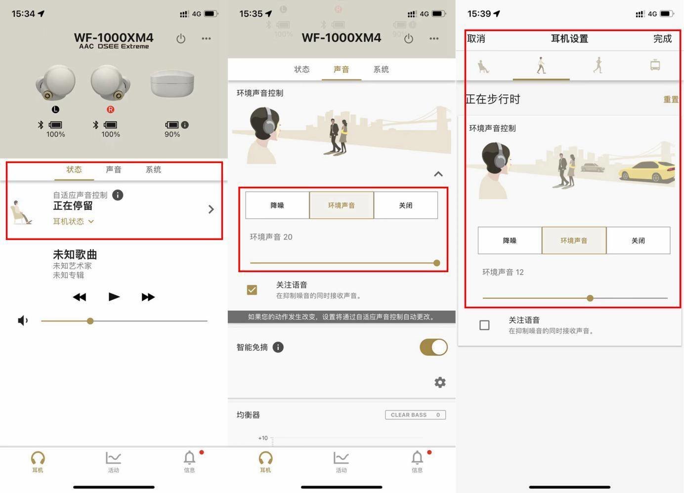 目前也有不少的耳机,支持这些功能;但是索尼做的就是,这些功能能够优化非常到位,比如自适应声音控制可以精准识别用户状态;环境声的20级调节,每一级都有着细微差异,再挑剔的用户也能满足自己的需求。