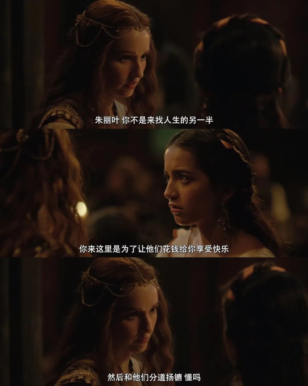 这样的罗莎琳,有着足够的戏剧张力。她完全是用现代人的开放思想,引领懵懂的朱丽叶,为她打开了新世界的大门。说是引领,其实算得上是降维打击。去低级酒吧和男性调情,一起看小黄文,朱丽叶以前想都不敢想的事,罗莎琳都带着她做了。