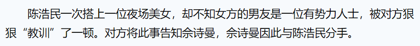 2002年,陈浩民与佘诗曼恋爱,四年后分手,理由是“偷吃”。