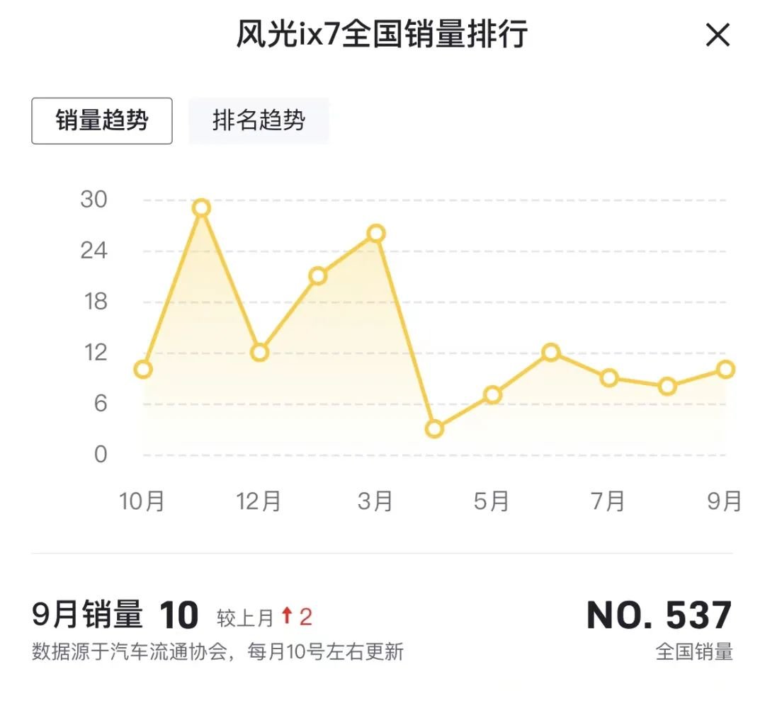 2022年1-9月份,东风风光iX7的市场销量表现则更差,刚刚过去的9月销量仅为10辆,前9个月累计销量为96辆,如此低的销量根本没有存在感,这样的车型还能存活多久呢?东风风光的日子有点难熬。