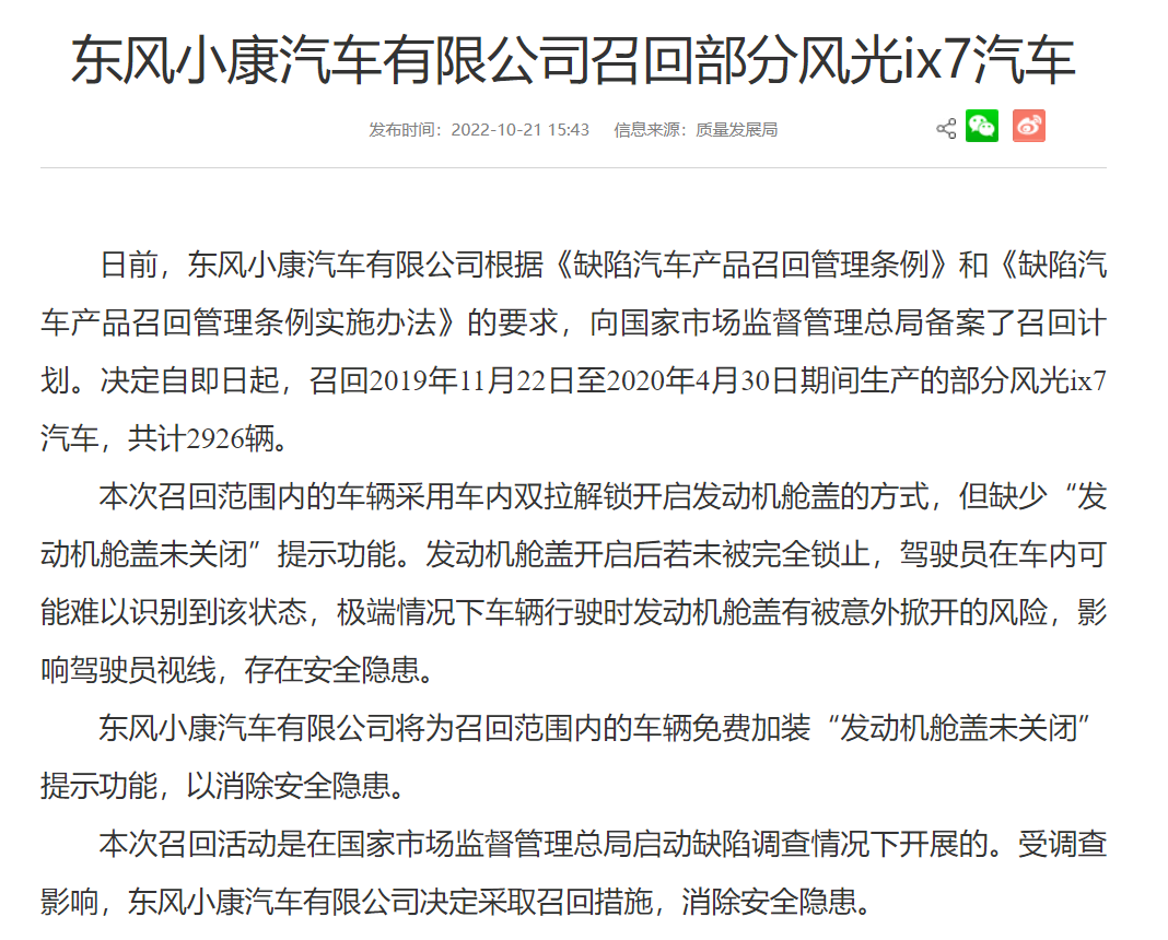 近日,东风小康汽车有限公司召回召回2019年11月22日至2020年4月30日期间生产的部分风光ix7汽车,共计2926辆。