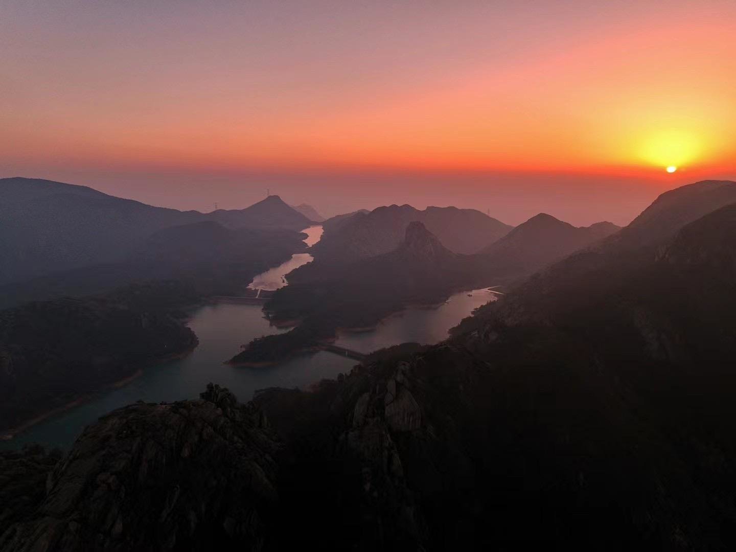 有一天,我们住在罗山恋,由于前一天喝了点酒,第二天起得晚了些,差点错过日出,于是在村口的那座小山上航拍天河水库的日出。