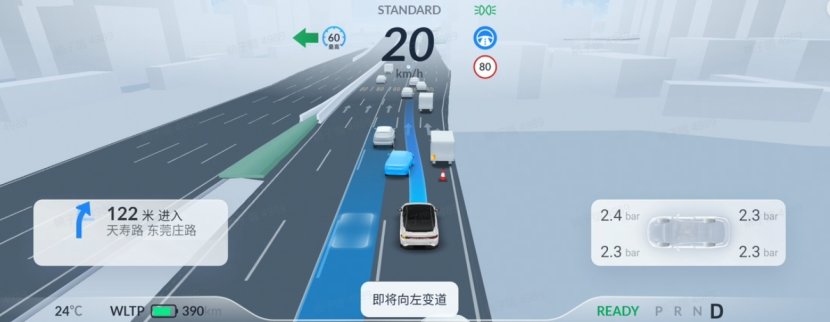 为了提供给驾驶者更丰富的信息感,小鹏还推出了行业首创的仪表SR智能辅助驾驶环境模拟显示,比如转向信号灯、车辆可行区域等。