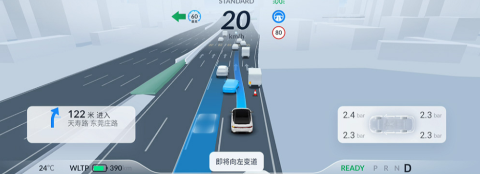 从技术角度而言,小鹏的城市NGP功能采用了行业首创多重融合方案,包括了摄像头、毫米波雷达、激光雷达等感知元件作为互补,同时布局在车头前的两颗激光雷达相比布局在车顶具有水平视觉更广和垂直视野盲区更小。另外,行业首创的仪表SR模拟显示,可以把傍车转向灯信号、车辆可行驶区域引导面、分岔路口的转向点提示。