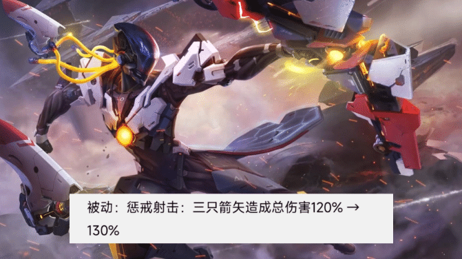 后羿之前的表现很出色。因为胜率高,整体实力变化很大,所以官方把后羿的实力降到了最低。但衰落之后,他发现后羿的常规打法还是比较弱,于是加了被动技能的攻击力。整个过程很简单,只是把三箭伤害降低到120%。分析:这是一个小改动,增加了一点伤害,但对后羿造成的伤害没有太大影响。这个调整可以说是一个小小的进步。