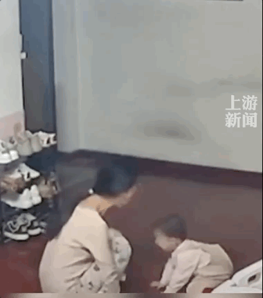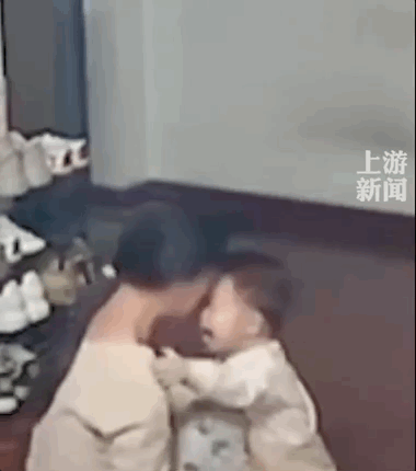 孩子被吓得哇哇大哭,尽管被妈妈推开,却还是一再上前试图抱紧妈妈。