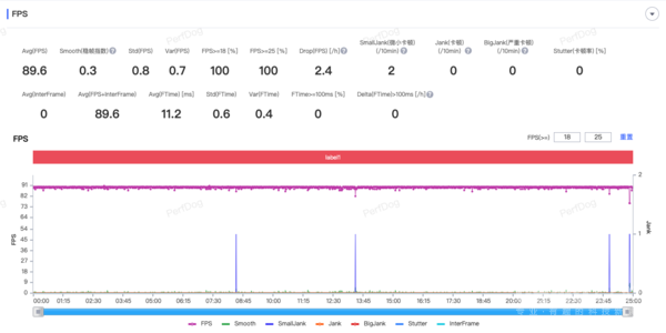 第二个测试的是《和平精英》,将帧率调整至最高的90帧,其他设置选择默认。整局大概在30分钟左右,我们选取了落地之后进行帧数记录,在25分钟的游戏时间里,平均帧数达到了惊人89.6,并且整个帧数曲线非常的稳定,比《王者荣耀》的跳动更少,说是一条直线都不为过。实际游玩时也没有感受到卡顿,整局游戏都保持在一个非常流畅的状态。