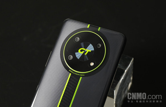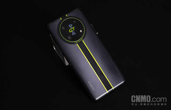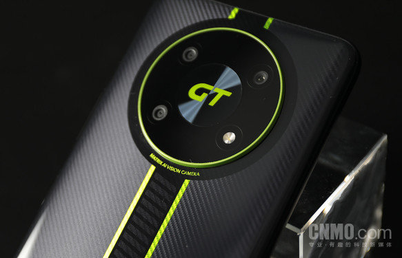 摄像头模组的部分,荣耀X40GT采用了荣耀机型上常见的圆形设计。周围一圈使用了荧光绿配色饰条进行包裹,三颗摄像头和一颗闪光灯在内部呈矩形排列,整个模组中心的位置是“GT”字样,同样使用了荧光绿配色。