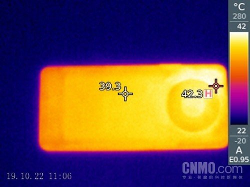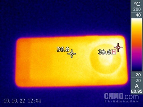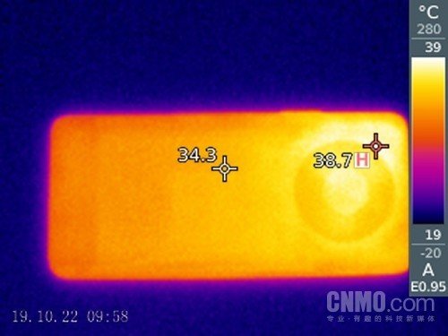 进行了15分钟对局之后,我们使用热成像仪对它的温度进行测试。机身背面的摄像头模组部分的温度最高的,为38.7摄氏度,背部中间的温度为34.3摄氏度。这个温度并不会让用户有太多的感受,甚至连温热都算不上。