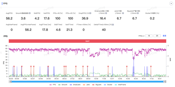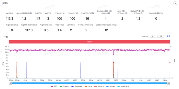 第一个测试的是《王者荣耀》,在游戏内将帧率调整是极高(120Hz),其他设置保持默认的情况下,进行了一场15分钟的对局。通过Perfdog的监测数据可以看到,其平均帧率为117.3,整个帧率曲线并没有大范围的跳动,始终能够保持在115-120帧之间,在实际游玩时并没有感受到帧率的波动,表现非常稳定。