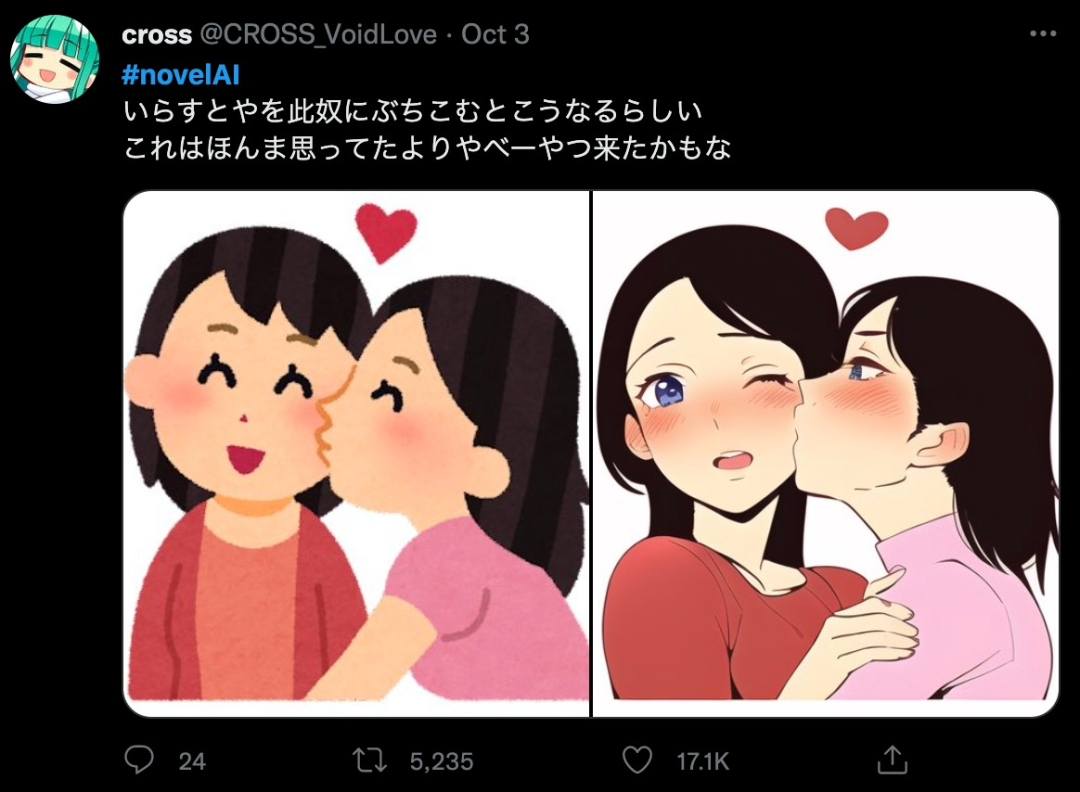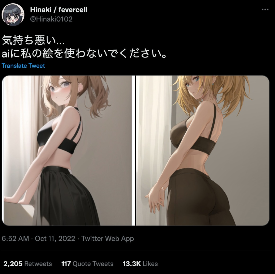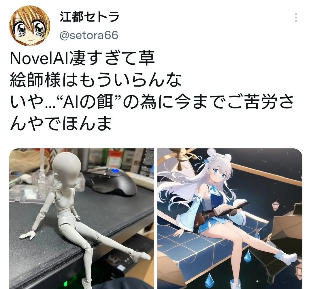 但由于本质上「Novel AI」还是把画师们的图当成素材使用,通过“拼贴”“合成”等方式来完成出图的,这款AI的法律问题也引起了极大争议。图为一位日本画师抱怨自己的作品(左图)被AI抄袭。