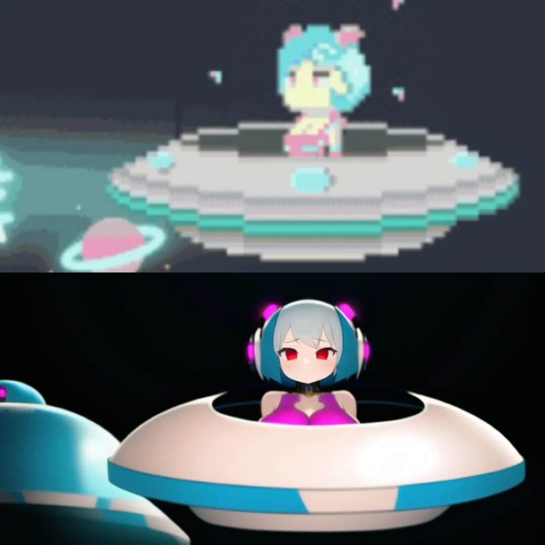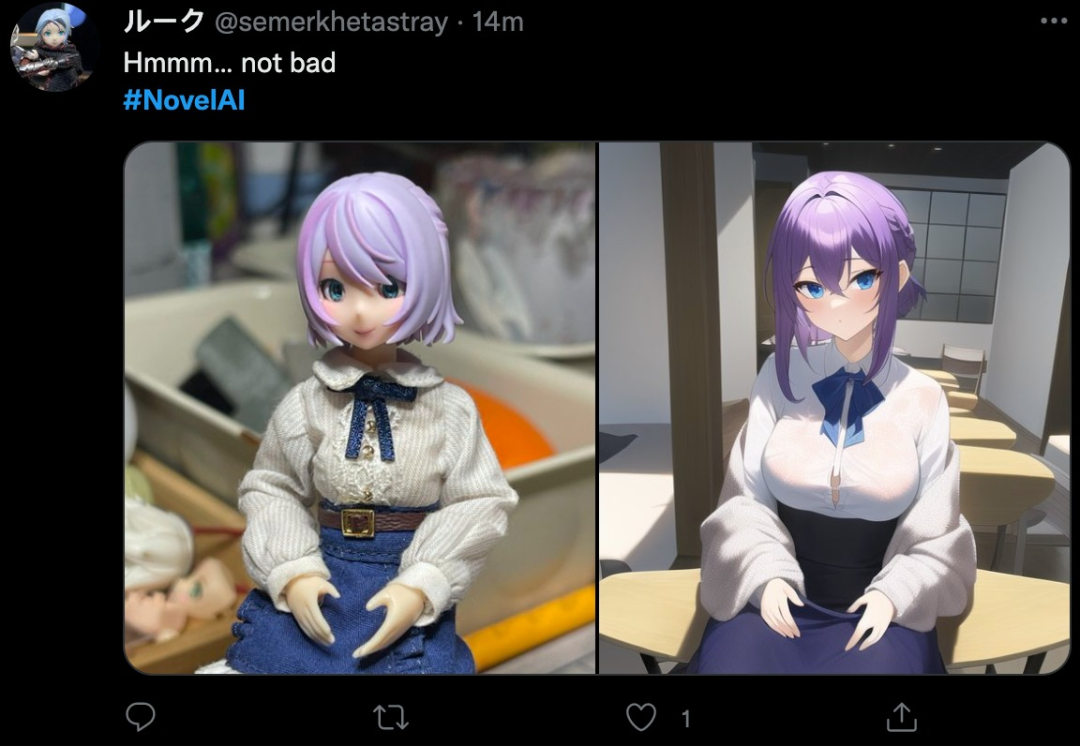 这些尝试者们很快发现,无论你输入什么样的底图,AI都能吐出一张十分相似的二次元美少女。靠着这种方式,似乎可以顺利“娘化”任何手办、角色、物品……