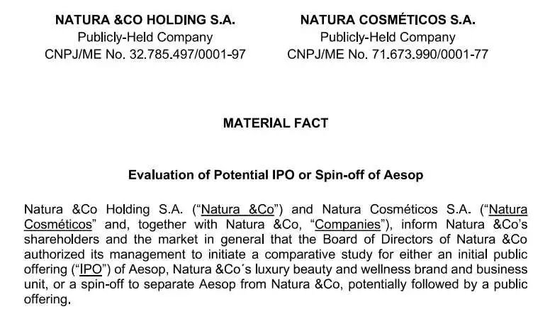 近日,巴西美容巨头Natura & Co发布公告表示:计划对旗下护肤品牌Aesop伊索进行公开募股或拆分,这样能够提供给Aesop伊索的业务部门提供更大的自主权。
