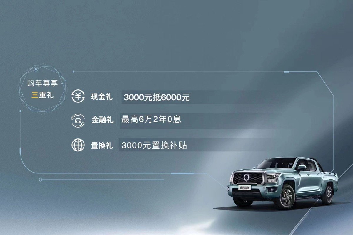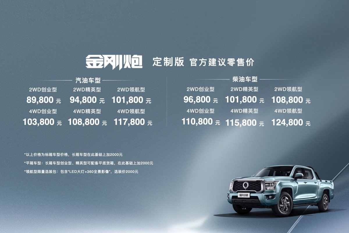 据了解,金刚炮定制版起售价为8.98万元,有柴油/汽油、两驱/四驱等多种版本可供选择。为回馈新老用户,购车还将尊享3000元抵6000元现金礼、最高6万2年0息金融礼及3000元置换补贴置换礼三重大礼。